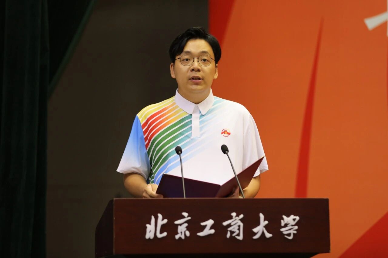 中国人民抗日战争暨世界反法西斯战争胜利80周年纪念大会志愿者、马克思主义学院廖承禹作为在校生代表发言,他分享了自己作为志愿者参与九三阅兵的经历,表示这是一次触摸时代脉搏、感受国家发展的生动课堂,体会到北工商人的担当与使命。同时他也提及了研究生生活的几点心得,希望新生们主动学习,寻找心之所向;大胆尝试,在实践中成长;心怀感恩,传递温暖与能量。最后,他勉励全体新生把个人的成长融入时代发展的浪潮,用“工商一体化”理念破解学科前沿难题,为学校高水平研究型大学建设贡献青春力量。