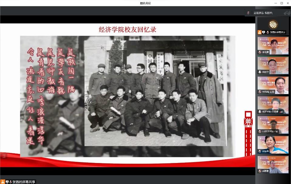 经济学院高度重视、充分挖掘、广泛联络、积极筹划,举办主题为“共叙校园情谊,铸就工商辉煌”的第七届值年校友日云端系列活动。吕东燕、学院领导班子、值年校友、时任班主任和教师代表百余人齐聚云端,共叙往昔深情,共襄发展大计。5位校友代表发言,感谢母校的悉心教导和培养。学院活动结束后,各专业分别在系主任的组织下召开校友交流座谈会,领导班子成员分别参会,与校友们共忆岁月年华,共话未来发展。