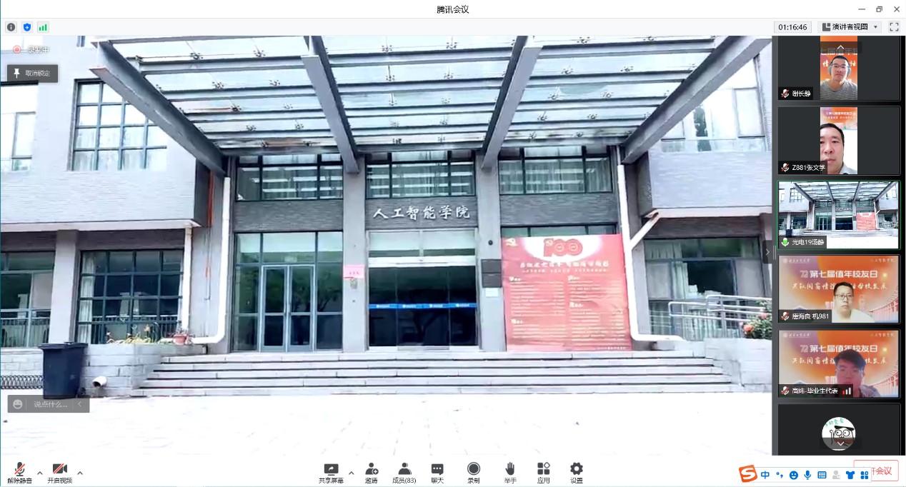 人工智能学院线上召开“共叙同窗情谊、共话母校发展”值年校友日活动,刘敏华出席活动并致辞。全体院领导、各系教师代表、值年校友代表、18级毕业生代表等共计89人参与活动。刘敏华谈到,校友是学校和学院发展最宝贵的资源,学校与学院将持续加强与校友的联系交流,促进联动合作,将曾经的学缘、情缘,转化为永久的事缘、业缘,携手共进、风雨同行。学院还开展了云端直播游览两校区风光特色活动,通过镜头带领校友们重返校园,得到了校友们的热烈响应。