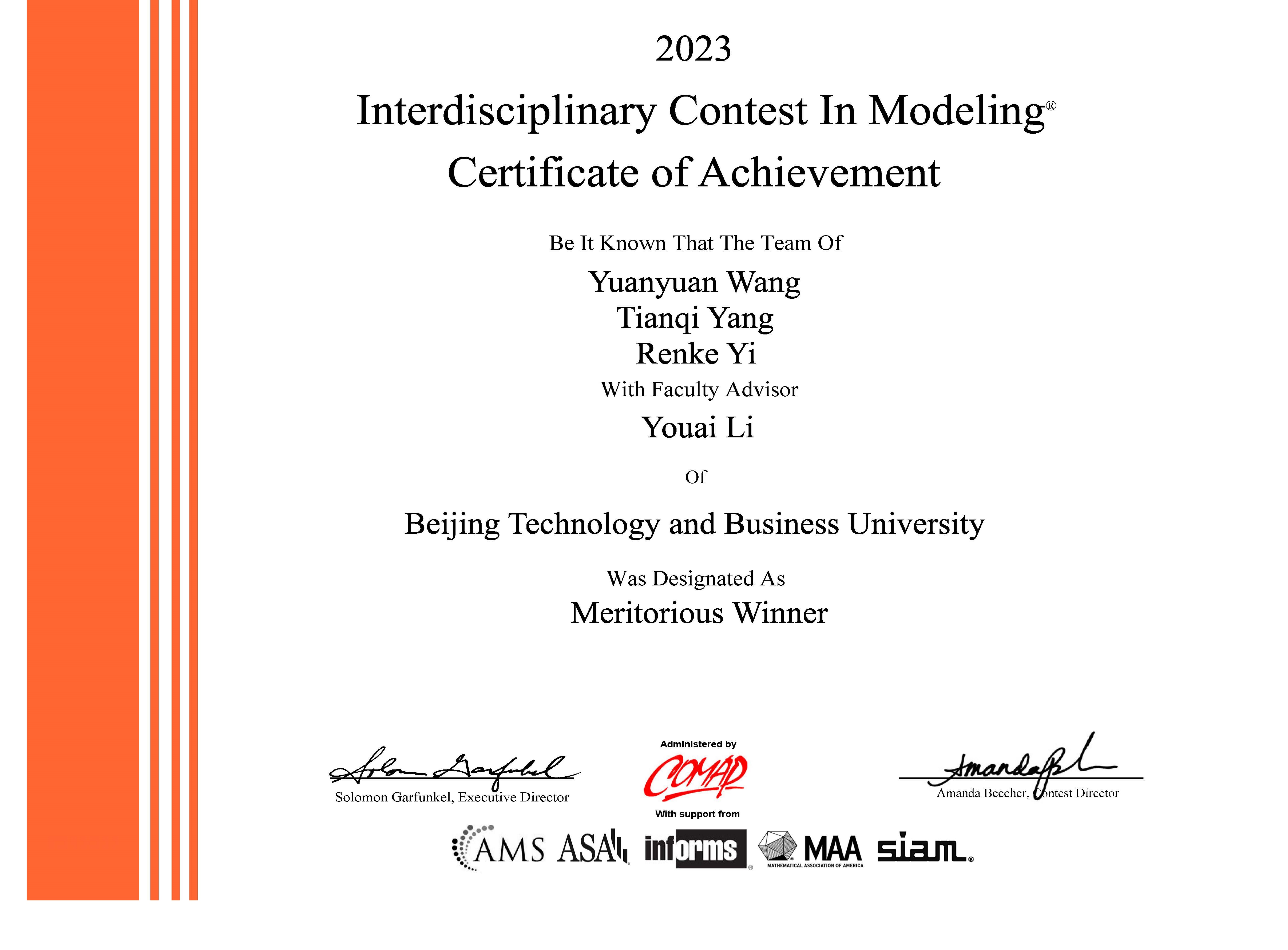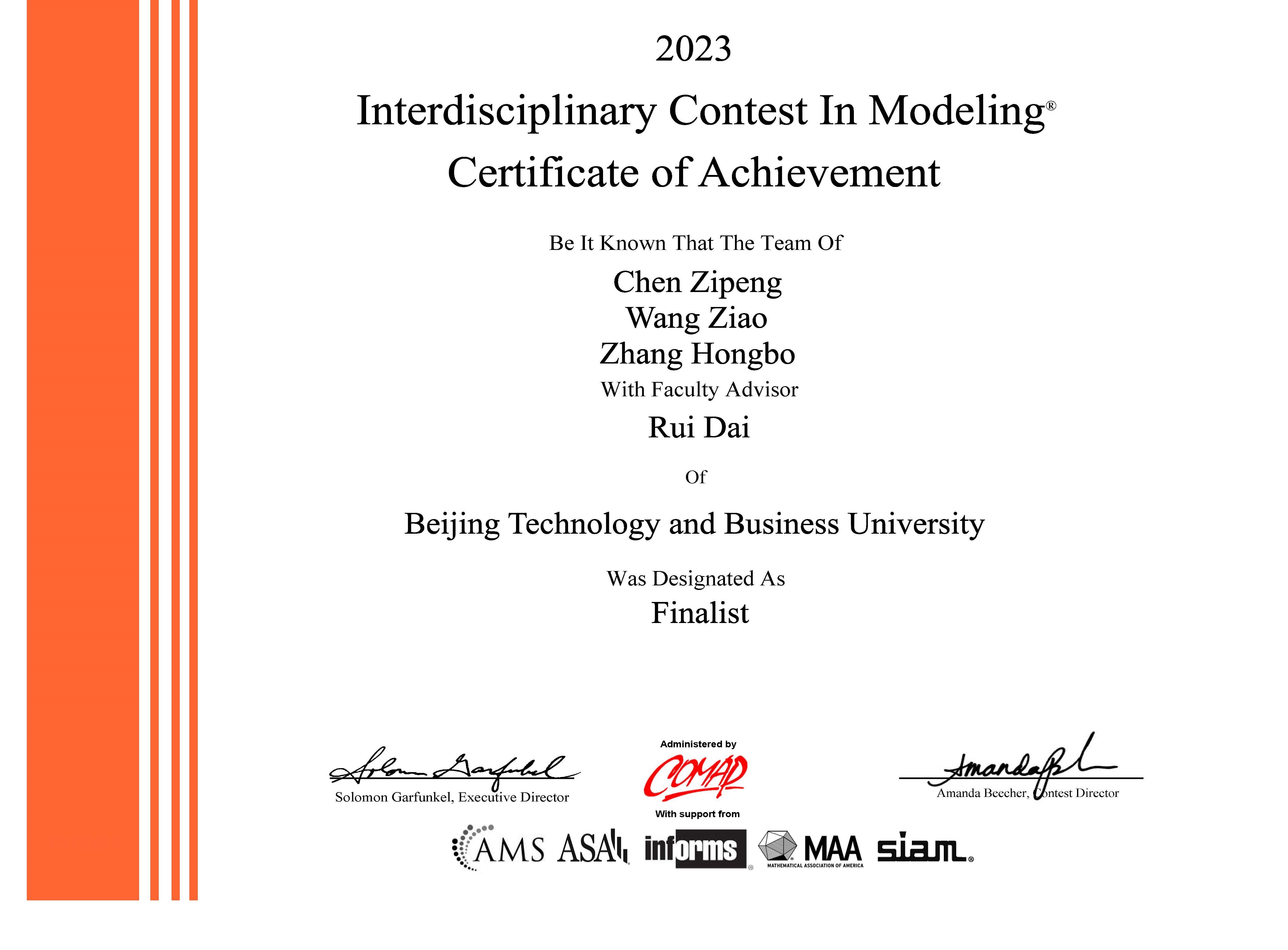 近日,2023年第39届美国大学生数学建模竞赛结果公布,我校20级注会专业(全英)陈子芃、19级注会专业王子翱、信息管理与信息系统专业张宏博获美国大学生数学建模竞赛Finalist奖(Finalist 1项),取得我校本科生参与该项赛事的历史性突破,为我校学子首次斩获F奖。此外,我校学子还获一等奖(Meritorious Winner)1项,二等奖(Honorable Mention)9项。