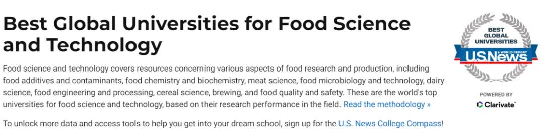 10月26日,US News发布2022世界大学排行榜,涉及85个国家,超过40个学术专业领域。其中,在食品科学与技术领域,全球共有200所大学入榜单,中国大陆共有36所大学入榜单。我校食品科学与技术学科位列全球第24位。