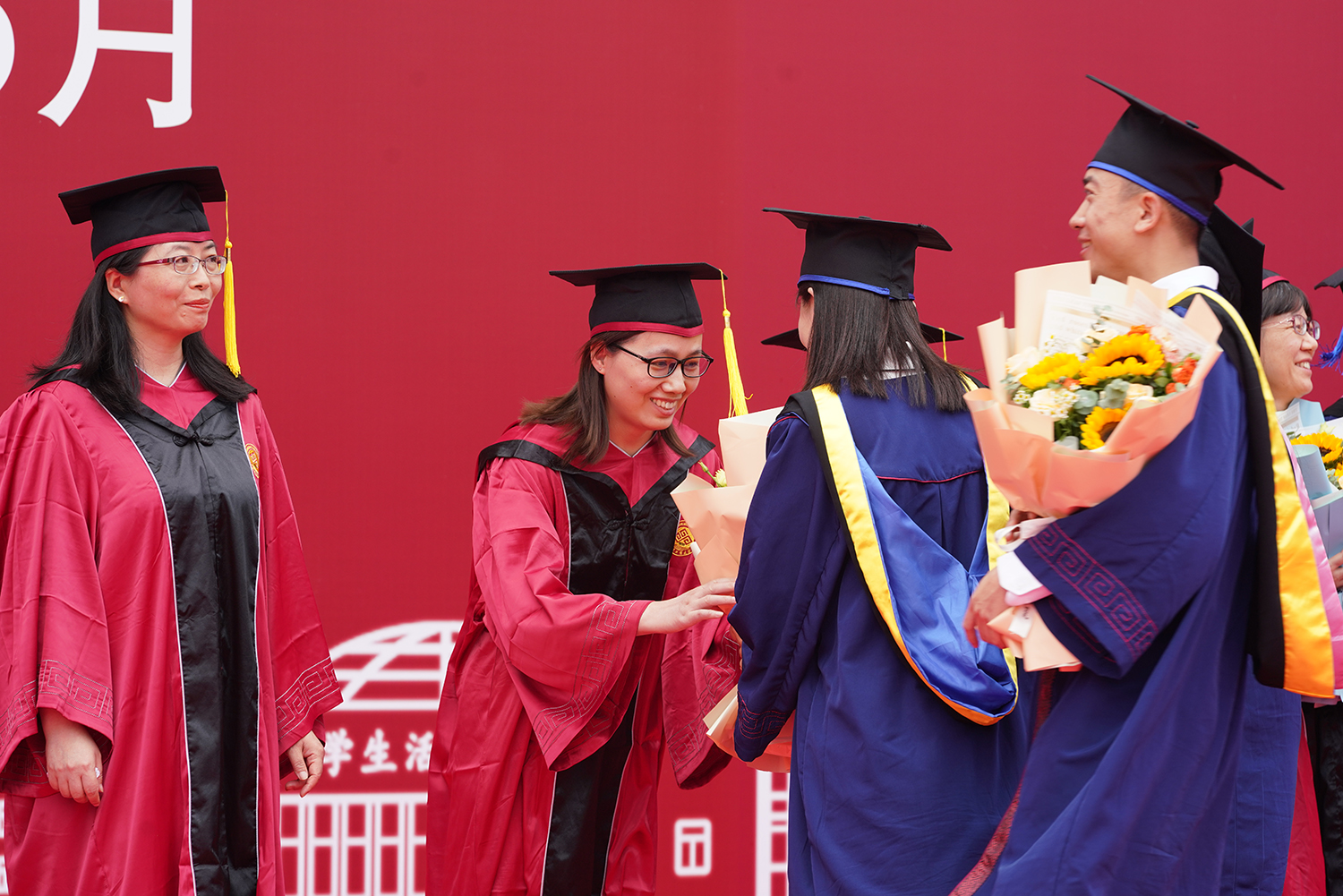 在响彻会场的掌声中,毕业生代表为导师代表献上鲜花,表达对导师的感谢、感激与感恩!