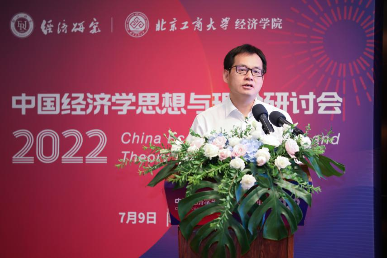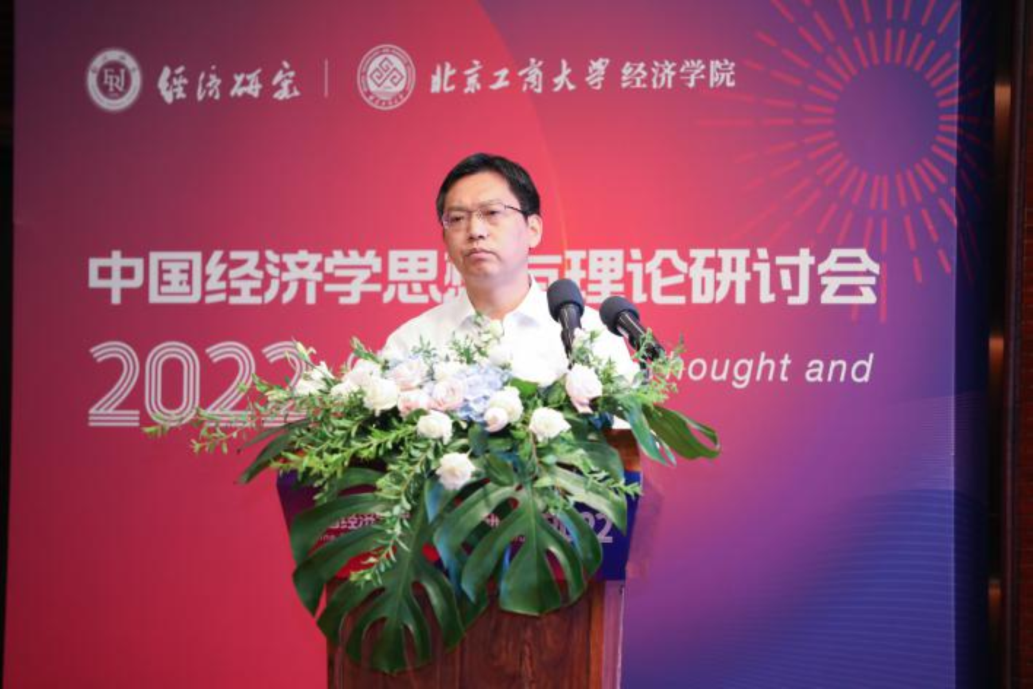 开幕式上,校党委书记黄先开致辞。他在致辞中对各位参会的专家和代表表示热烈欢迎和感谢。他指出,2022年是我国进入全面建设社会主义现代化国家、向第二个百年奋斗目标进军新征程的重要一年,党的二十大也即将召开。当下研讨引领时代发展的经济学理论,具有特殊重要的意义。恰逢《习近平经济思想学习纲要》发行,习近平经济思想深刻回答了新时代经济发展怎么看、怎么干等一系列重大理论和实践问题,是我国经济高质量发展、全面建设社会主义现代化国家的科学指南,也是现代经济学思想与理论研究的根本遵循。黄先开呼吁经济学者坚持不懈用习近平新时代中国特色社会主义思想武装头脑、指导实践、推动工作,立足于中国经济发展的实践历程,在思想和理论上不断创新,为新时代中国经济发展建言献策。黄先开表示,北京工商大学是新中国成立后中央批准创办的第一所商科学校,传承与生俱来的红色基因与商科血脉,始终坚持党的领导,深耕家国情怀,开拓创新,走在前列,是北京市重点建设的高水平研究型大学。应用经济学科是学校的优势学科,多年来聚焦数字经济、新发展格局、财税体制改革、普惠金融、数字金融、“一带一路”等重大问题,主动服务国家、区域和行业发展,为国家相关规划政策制定及首都经济社会发展贡献智慧。黄先开书记预祝本届研讨会取得丰硕成果,成为引领中国经济学思想与理论前行方向的盛会。