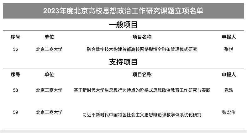 2023年度北京高校思想政治工作研究课题立项名单日前公布,我校3项课题获批立项。党委宣传部张悦申报的《融合数字技术构建首都高校网络舆情全链条管理模式研究》获批“一般项目”,学生处党浩申报的《基于新时代大学生思想行为特点的阶梯式思想政治教育工作研究与实践》和马克思主义学院张宏伟申报的《习近平新时代中国特色社会主义思想概论课教学体系优化研究》获批“支持项目”。