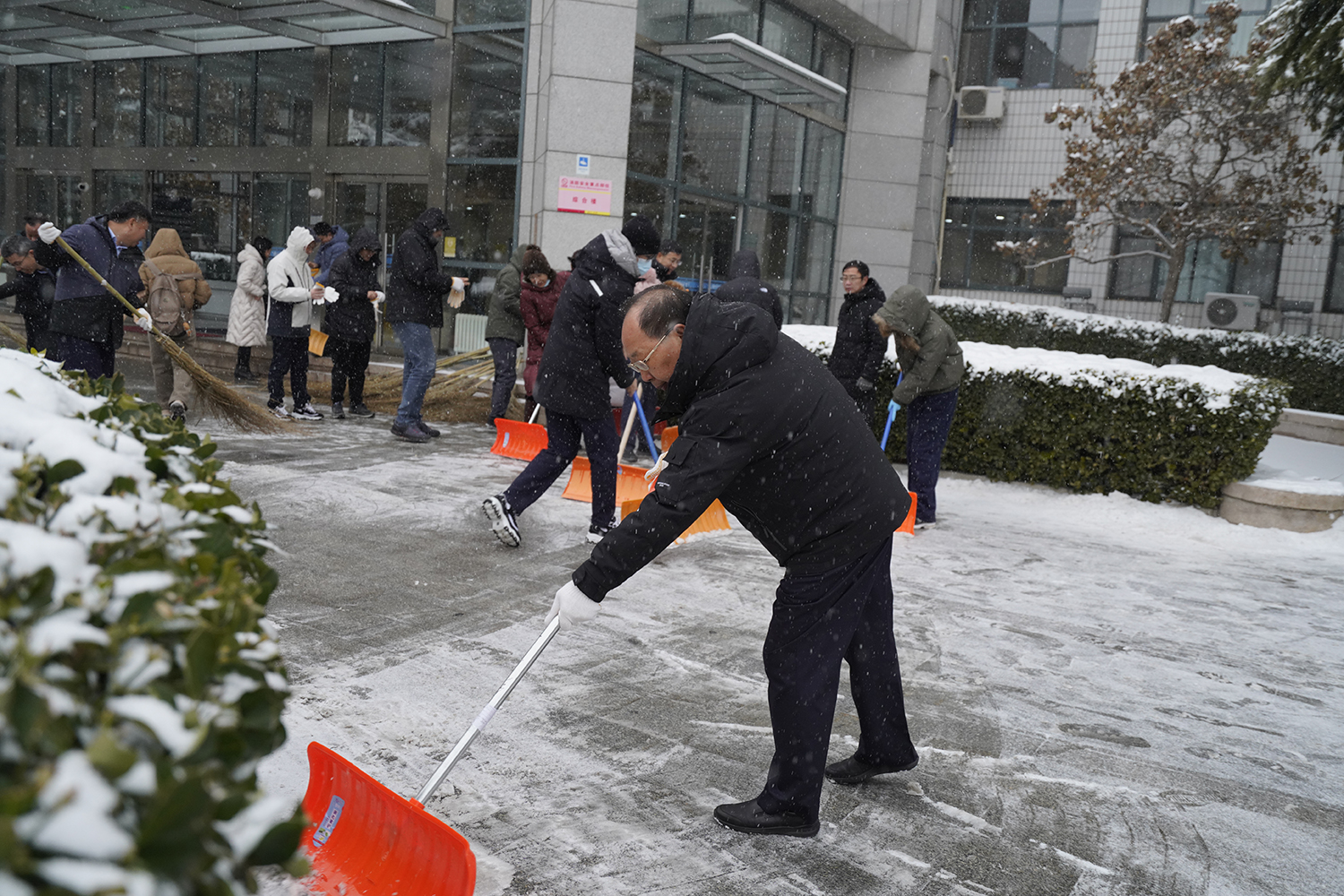 清晨八时,学校党委书记黄先开,党委副书记、校长郭建华等校领导带领机关干部扫雪铲冰,清理路面积雪,保障校园路面畅通。同志们顶风雪、冒严寒,在除雪铲冰的各个关键点位团结协作、干劲十足。一个个浴“雪”奋战的身影,在皑皑白雪中构成了一道美丽的风景线。参与行动的教职工谈到,“大家一起劳动,虽然辛苦,但看到路面清理干净,学生们安全通行,心里感觉暖洋洋的。”