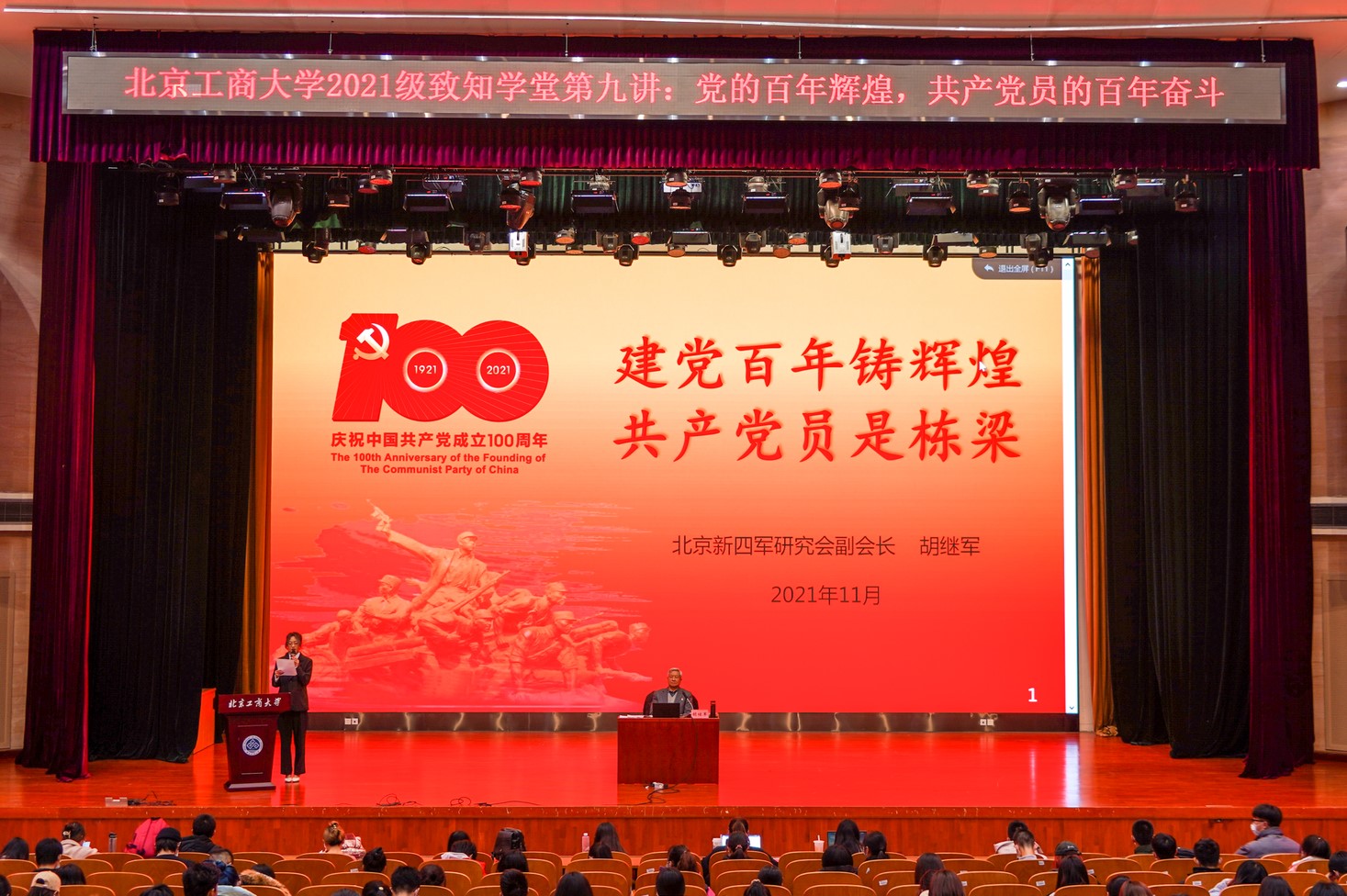 11月16日,北京新四军研究会副会长、北京铁军文化传播中心秘书长胡继军以“建党百年铸辉煌,共产党员是栋梁”为题,从共产党人的初心使命讲起,讲述了新四军军长叶挺将军以及胡继军的父亲、母亲、岳父三位新四军战士在战争年代坚定信念跟党走、英勇作战、不怕牺牲、无私奉献的故事,讴歌了中国共产党党员和人民军队坚定的理想信念、崇高的思想境界和优秀的道德品质。