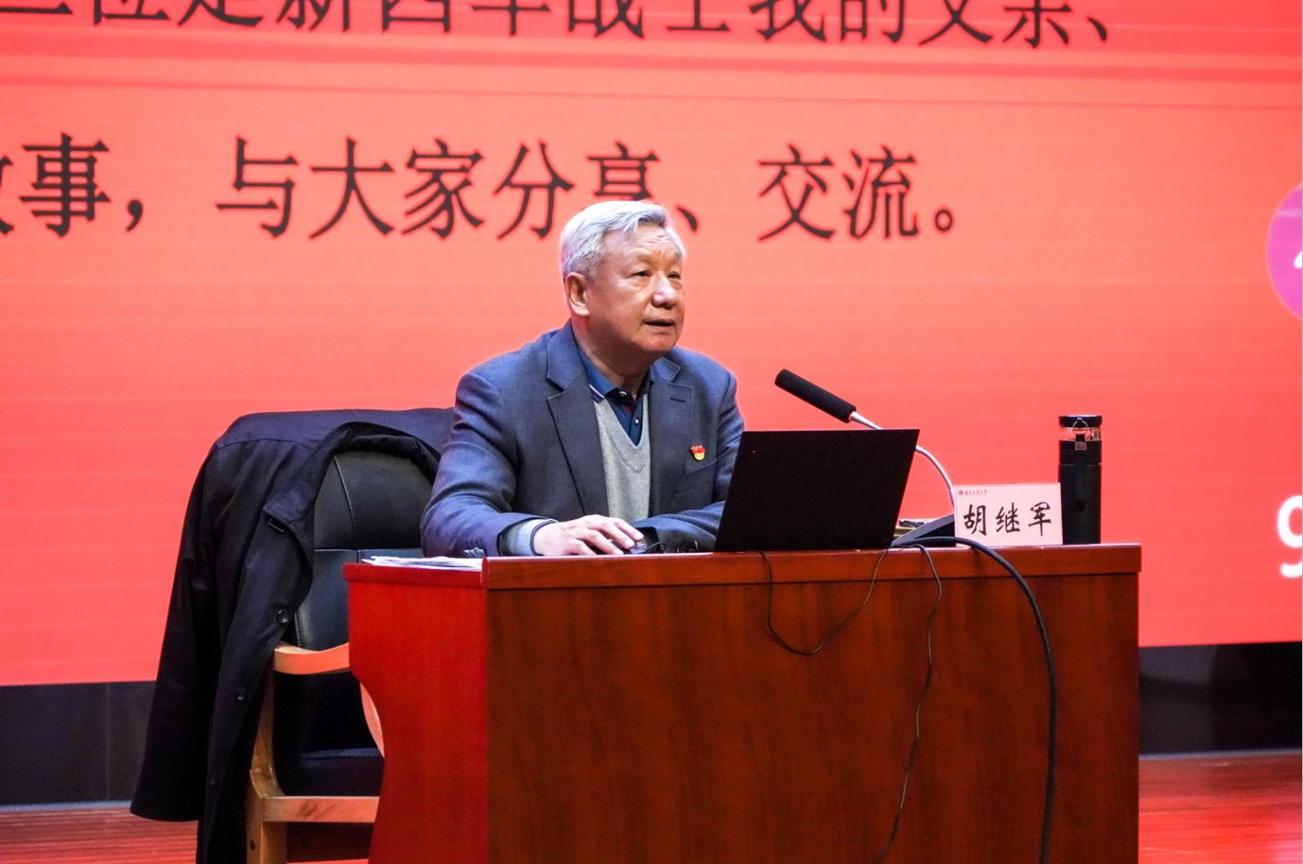 在讲述新四军军长叶挺的故事时,胡继军表示,叶挺是一位坚定跟党走、对党绝对忠诚的优秀领导人。抗日战争爆发后,远在欧洲的叶挺毅然回国、临危受命,担任新四军第一任军长,率部队多次粉碎了日军的“扫荡”“围剿”。皖南事变后,他被国民党扣押、囚禁,但他依然保持着所向披靡的铁军精神和共产党人高尚的革命气节。在讲述母亲唐渠的故事时,胡继军谈到,对人民无比热爱,是共产党员的本质特征,他讲述了唐渠在抗战中与日伪军作战、依靠老百姓保护伤病员生命安全的亲历故事。唐渠曾多次提及,抗日战争充分体现毛主席“人民战争”的思想。新四军是人民子弟兵,能在敌强我弱的环境中生存、壮大,靠的是军民鱼水情。在讲述岳父晓星(原名孙德培)的故事时,胡继军表示,对使命勇敢担当,是共产党员的行动准则。晓星所在的部队参加了铜山阻击战,由于战事频繁激烈,晓星在一次反冲锋后被敌人的枪弹击中,手中的步枪被子弹击成了两段,倒在了血泊之中,凭着对抗日救国大业必将胜利的信念,和要活着回到新四军部队的决心,晓星从死神手中挣脱。胡继军表示,晓星这段战斗经历也是共产党人使命重于泰山、视死如归革命精神的缩影。