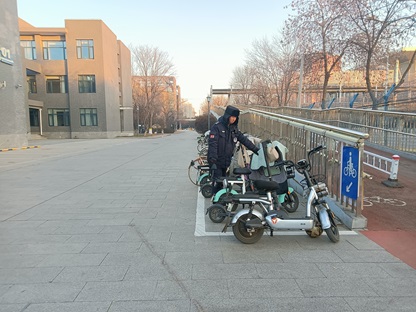 宣传疏导,规范校园非机动车管理。保卫处联合学校青年志愿者协会组织引导电动自行车和自行车安全秩序,向全体学生发起交通安全倡议,在校园22个主要交通枢纽点位安排安保人员和学生志愿者提醒师生安全骑行、规范停放。