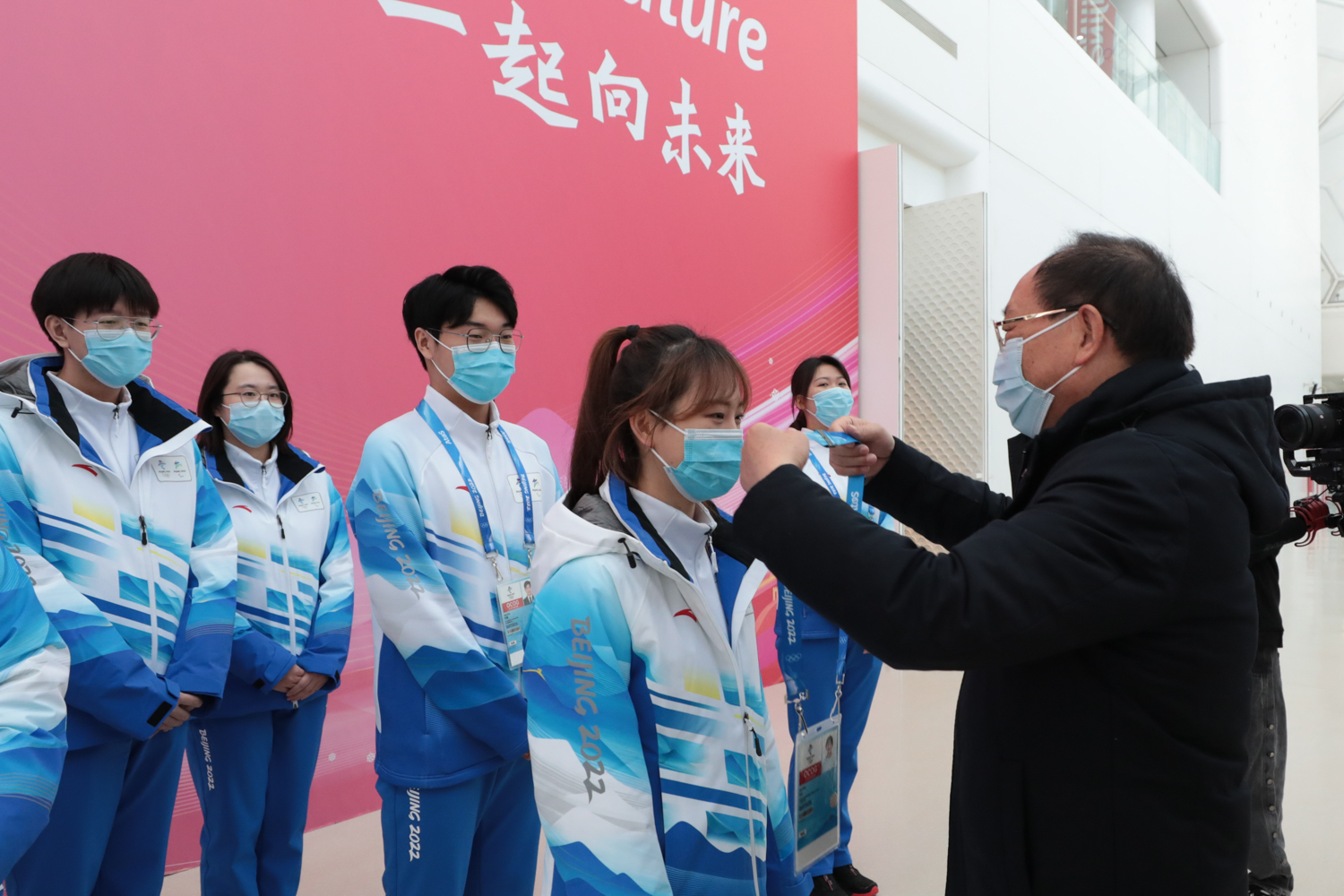 党委副书记李中奇向志愿者赠送了暖心物资,详细了解了志愿者们的衣、食、住、行等方面保障情况,李中奇勉励志愿者要体味校徽中“三品”中的深刻涵义,以优质的服务水平和昂扬的面貌践行志愿精神;在工作过程中不断提升综合素质,听从指挥,甘于奉献,掌握工作规律,团结协作,用最完美的服务、最精彩的表现代表中国温暖世界;同时希望我校志愿者可以经受重重考验,圆满完成志愿服务任务,并及时向学校反馈工作情况,反映保障需求,学校永远是冬奥志愿者坚强的后盾!