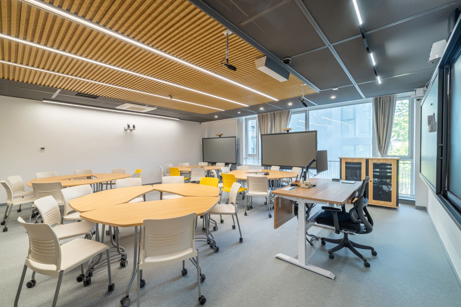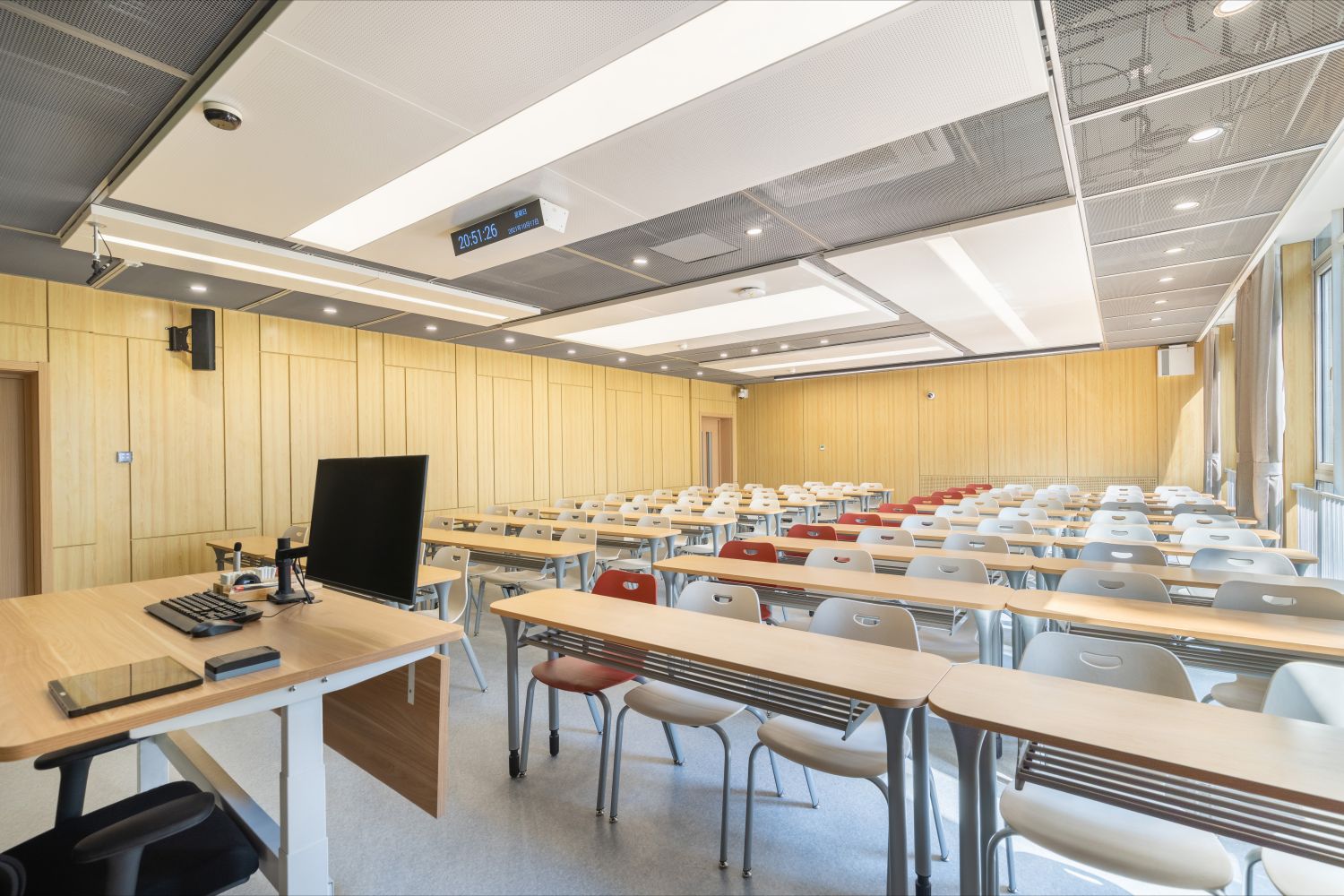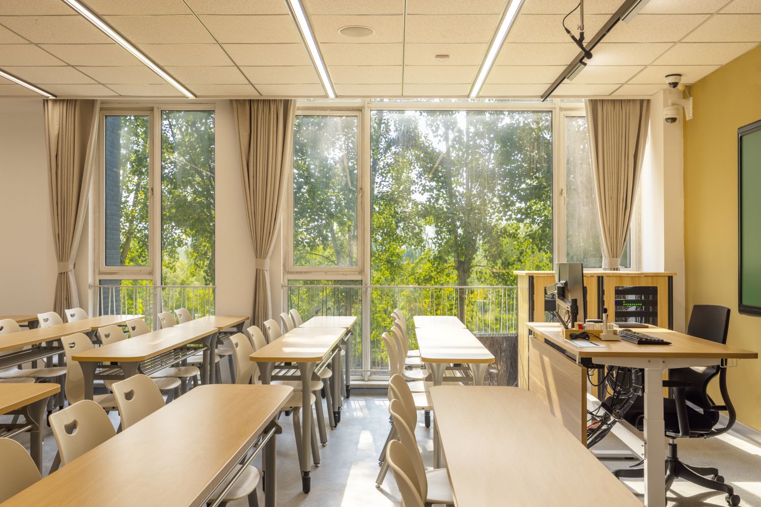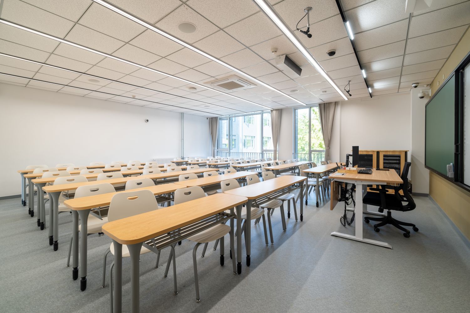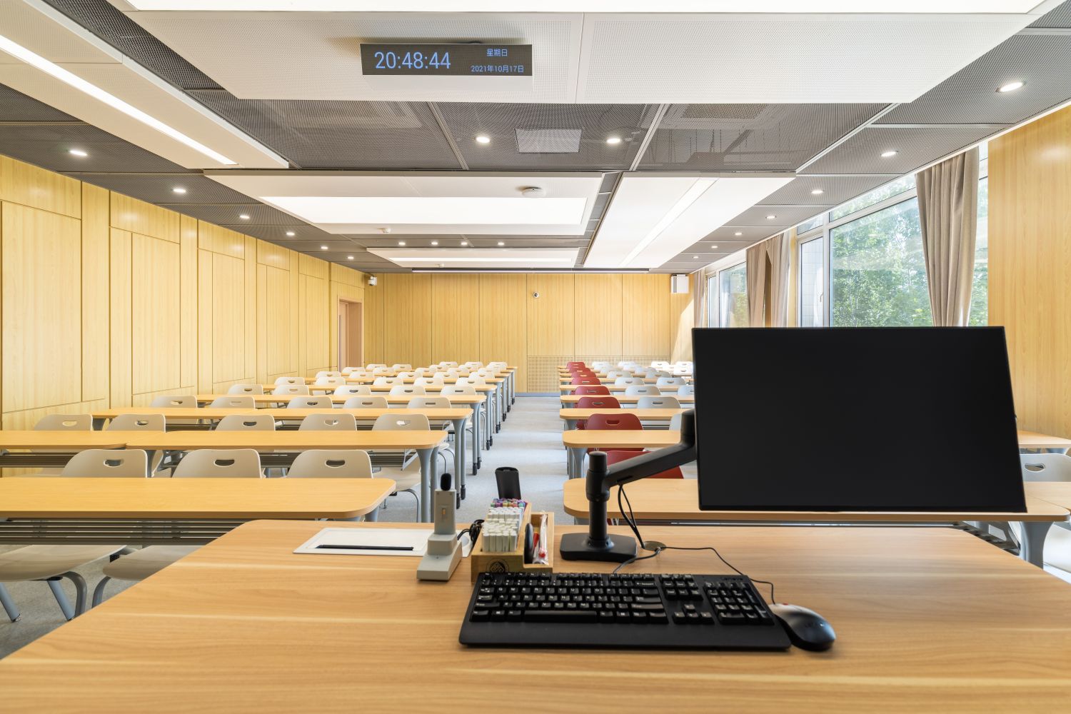 新建智慧教室登录腾讯便可调用教室内摄像头,跟踪教师走动位置,便于线上学生观看教师授课、板书及互动,实现了线上线下混合式教学;提供了大屏、记忆黑板、电子白板、玻璃白板、实物展台等多种书写方式,每间教室黑板多层可推拉,大大增加了书写面积,实现了自由自主、随心便捷的书写模式;考虑到大教室幕布遮挡黑板的情形,中控面板首页设置了一键幕布升降功能,教师可随手调整幕布升降,免去了遮挡困扰;设置多种扩声模式,“一师一麦”、“一室一麦”,辅助吊麦,手持买和吊麦在不同区域讲话自动切换,教师即使未携带任何扩声设备,也不用担心授课扩声问题;电子时钟双面显示,无论教师还是学生微微抬头便可轻松观看时间;教室内教师机显示器采用大屏超薄配置,可触控、可书写,自带隐藏式摄像头,360度可旋转,便利教师教学;教室内使用U盘录制的课堂实录,下课拔走即带走,无需手动下载;教师讲台可升降,配有无尘膜衣粉笔、硬质粉笔、软质粉笔、喷水板擦、干湿两用板擦、电子教鞭、眼镜收纳,讲台边配有水杯托、衣帽钩,学生桌椅也配有桌斗,方便师生放置个人物品。类似的人性化设计细节还有很多,教务处始终秉持教学服务没有止境的理念,用心设计和处理每一处细节,也将在后续教学过程中不断听取师生的使用意见反馈,积累完善,精益求精。