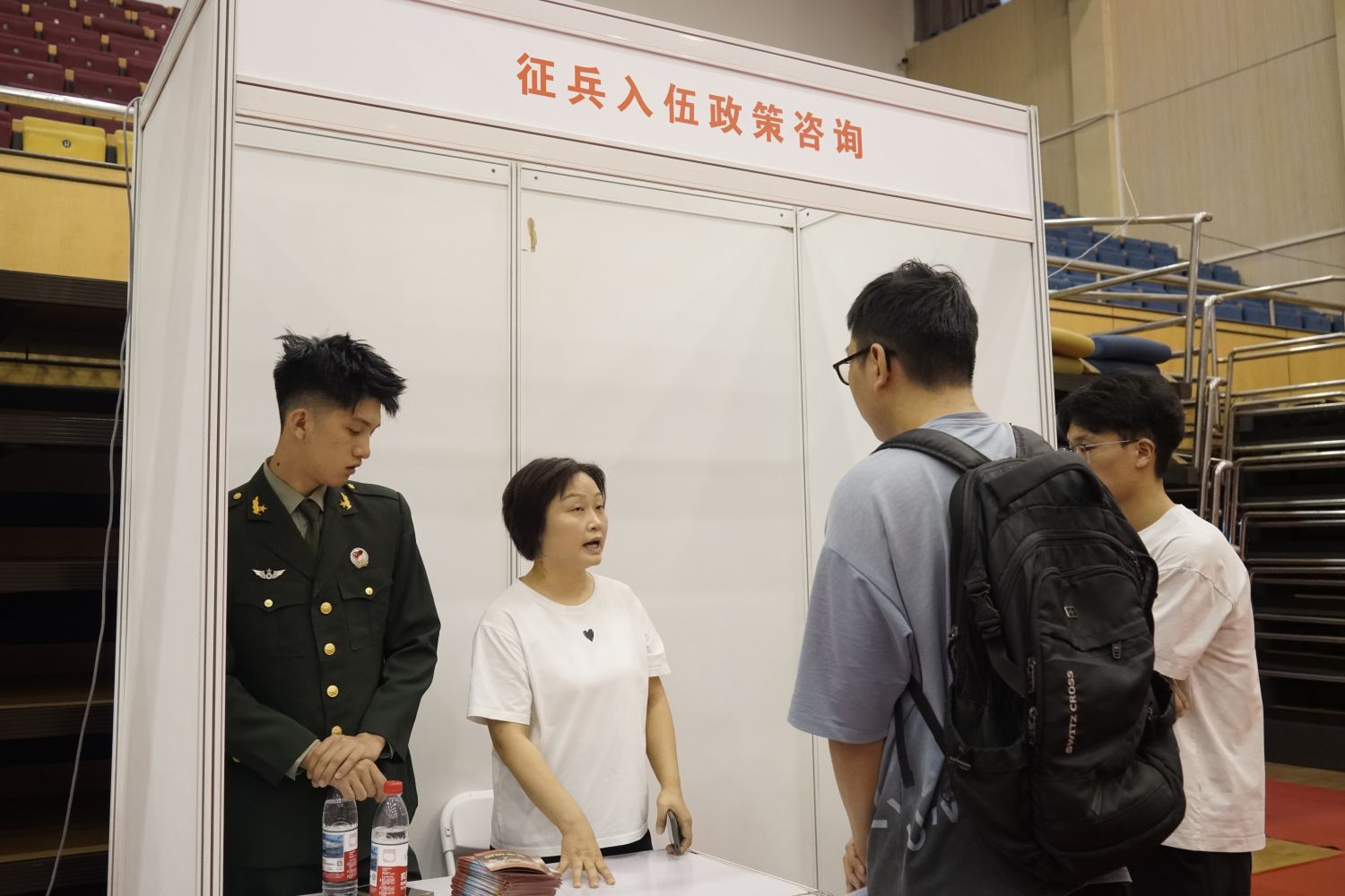 在双选会现场,“北京市高校就业指导服务站专区”的亮相格外引人注目,吸引了大量学生前来关注,成为双选会的一大亮点。我校作为北京市高校首批就业创业指导服务站建设试点单位,与北京市就业促进中心、房山区人力资源和社会保障局等联合打造了“就业指导服务站专区”,为学生们现场带来简历指导、就业政策咨询、征兵入伍政策咨询、公招政策解读、出国留学咨询和就业技能培训等一系列贴心指导和服务。在简历指导展位前,学生们排起了长队,纷纷针对手中的简历仔细聆听咨询老师给予的贴心修改建议。在就业政策咨询台,来自房山区人保局毕业生就业服务科的工作人员为学生们耐心解答着关于公招政策、创业和灵活就业保险政策、乡村振兴协理员报名等各方面的咨询问题。在征兵入伍政策咨询台,我校武装部老师和退伍学生骨干针就学生关心的征兵入伍政策进行详细解读,积极回应学生关切问题,鼓励青年学子携笔从戎,建功军营。