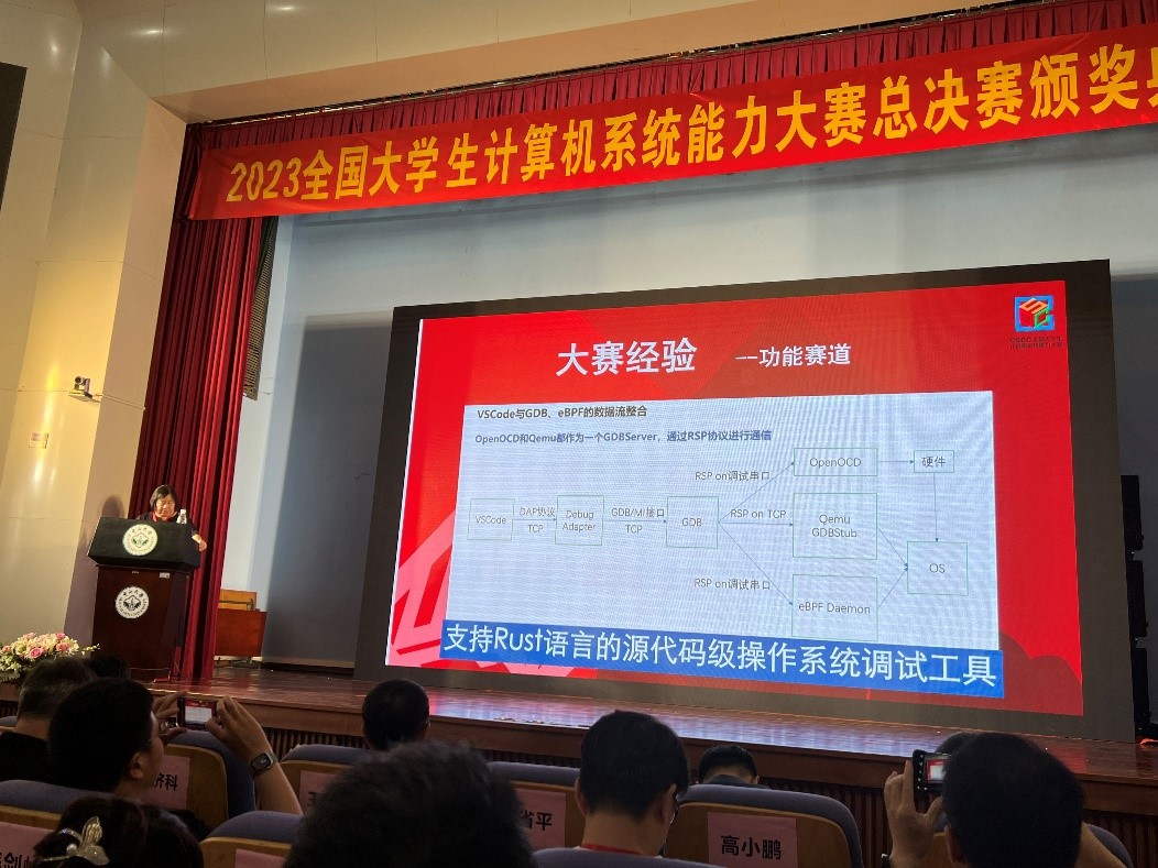 “trap_handler队”历经5个月的努力,实现了一套支持Rust操作系统内核开发的源代码级调试工具,支持跨内核态和用户态的源代码跟踪调试,包括静态断点调试与动态性能检测跟踪,并基于VSCode插件搭建远程开发环境。在答辩环节中,队伍的成果得到了评审专家们的高度评价,并最终获得大赛功能挑战赛道举办三年以来唯一一个特等奖(前两届特等奖空缺)。