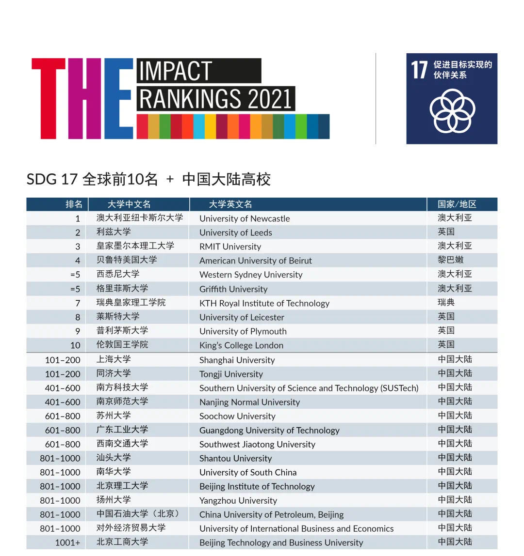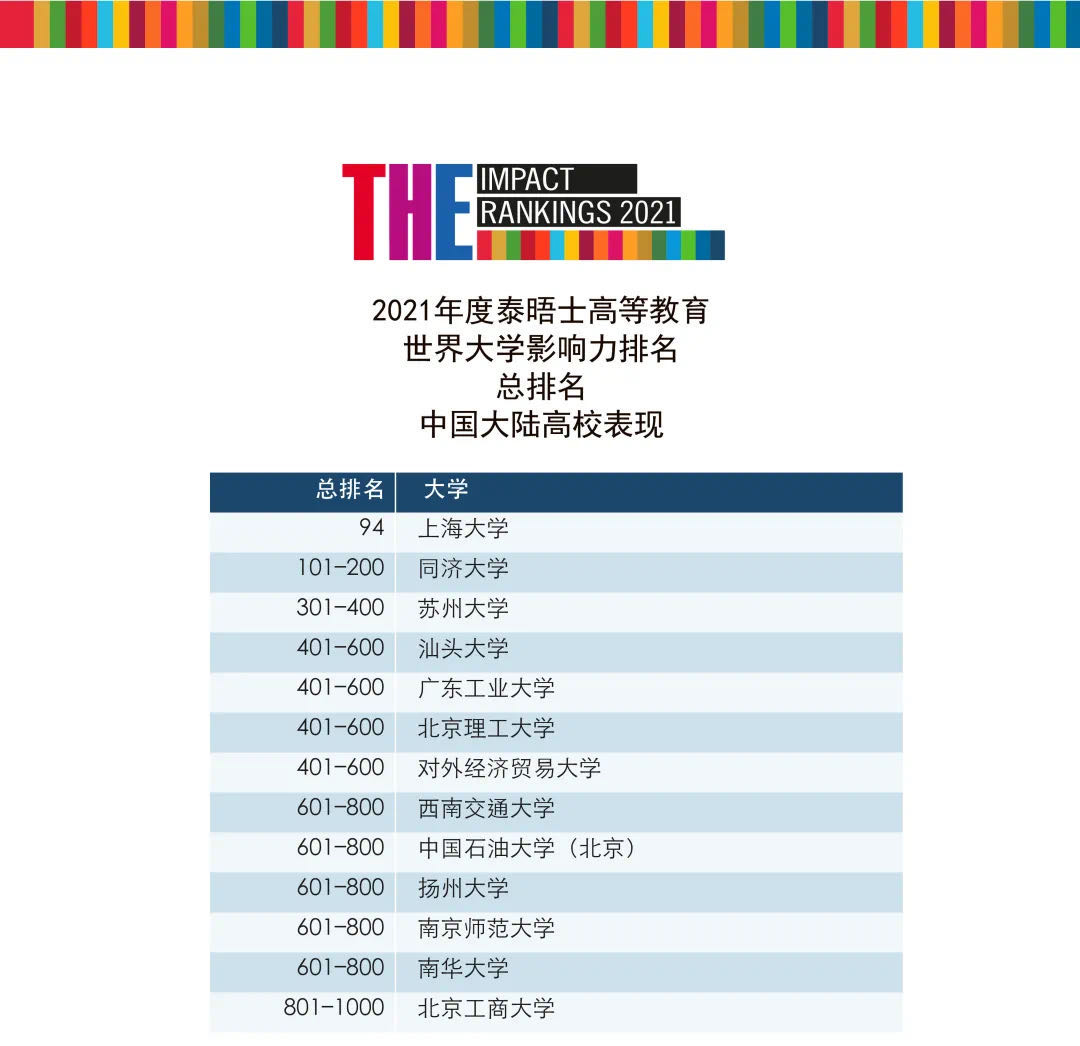 4月21日,泰晤士高等教育(THE)发布了2021年世界大学影响力排名。本次排名中,共有北京工商大学同上海大学、同济大学、苏州大学等19所中国大陆高校上榜。我校分别上榜总排名和3个SDG单项排名。