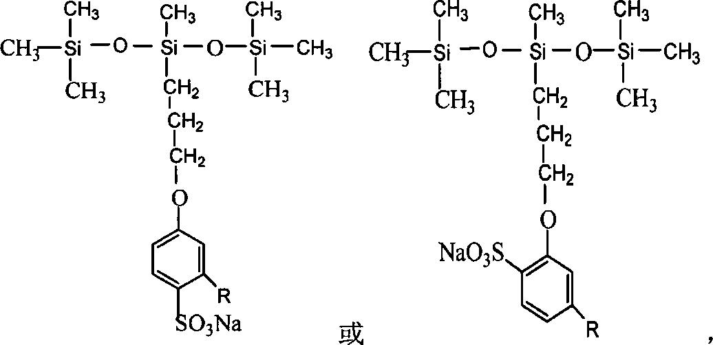 其中,R代表C15H31。 本发明提供了上述的含硅氧烷的腰果酚新型表面活性剂的制备方法。其制备方法是由氯丙基三硅氧烷与生物质腰果酚磺化物反应,然后分离纯化可得到含硅氧烷的腰 果酚新型表面活性剂。本发明含硅氧烷的腰果酚新型表面活性剂同时具有含硅表面活性剂和腰果酚表面活性剂的性能特点,具有溶解性好,皮肤刺激性小,生物降解 性优良;并能与其它表面活性剂配伍性好;其表面张力为18-24mN/m。