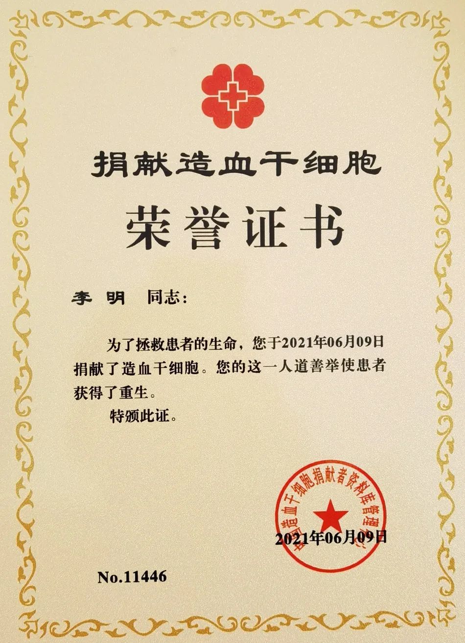 两个月后,体检合格的李明躺在了安徽医科大学第二附属医院的病床上,温热的血液正从他挽起袖口的手臂中缓缓流出,进入血细胞分离机,分离出的造血干细胞将救助远方一位罹患白血病的年轻父亲。汩汩鲜血顺着输液管向上流淌,李明仿佛看到了这位父亲生命的延长线。历经5个多小时,李明成功捐献155毫升造血干细胞混悬液,成为全国第11446位造血干细胞捐献者。