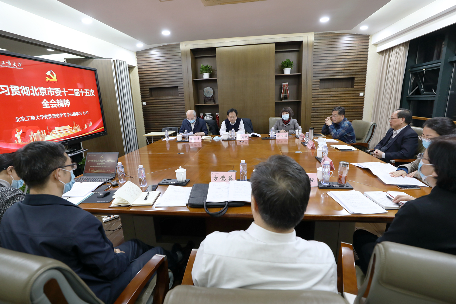 黄先开书记在总结讲话中,从发展原则、发展目标、发展战略、发展抓手、发展保障五个维度,系统阐释了市委十二届十五次全会精神,并提出了下一阶段工作要求。他指出,要深入研究、准确把握北京市“十四五”规划和2035年远景目标,并以此为指引,找准着力点,推进学校发展。他谈到,市委全会明确了“十四五”时期北京经济社会发展的原则,一是推动高质量发展,二是坚持创新驱动发展,三是构建新发展格局;提出了发展目标,即首都发展应当始终坚持首善标准,各项工作都要争创一流、走在前列,率先基本实现社会主义现代化;强调了发展战略,一是深入落实“四个中心”战略定位,二是深入实施“三个北京”战略,三是深入推进京津冀协同发展战略;指出了发展抓手,即抓好“两区”“三平台”建设;指明了发展保障,一是坚持和加强党的领导,二是强化人才队伍建设。黄先开书记强调,首都未来发展蓝图已绘就,学校各单位要紧密对接中央和市委规划建议要求,联系学校实际,坚持首善标准,谋深谋实学校“十四五”时期各项工作任务,以建设国际科技创新中心为新引擎,以“两区”“三平台”建设为衔接点,充分发挥相关学科专业优势,持续深化体制机制创新,大力引进和培养高端人才,不断提高站位、开阔视野,内挖潜力、善借外力,探索创新驱动跨越发展的北工商模式,在全面建设社会主义现代化国家新征程中作出北工商贡献。