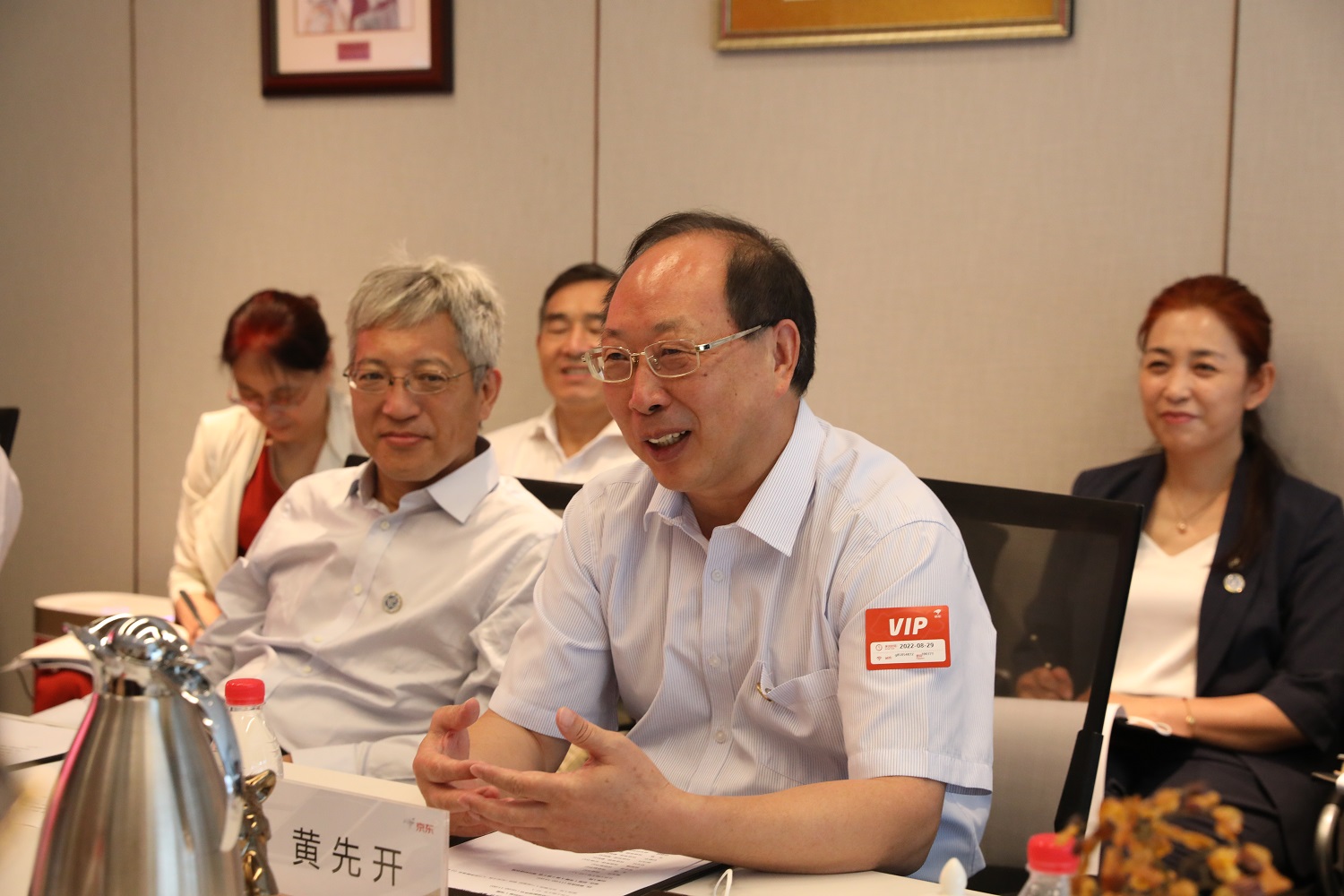 参观结束后,双方进行了座谈交流。党委书记黄先开就调研学习的安排作简要说明,并详细介绍了学校近年来的建设发展情况和当前学校的重点工作。他指出,近年来,学校在北京市委市政府的坚强领导和支持下,各项事业发展迅速,不断迈上新的台阶,构建并形成了与具有商科、轻工和食品特色的高水平研究型大学相协调的一流学科体系。学校明确提出,要加快“双一流”建设,举全校之力推动食品科学与工程学科进入全国前三名、成为世界一流学科,同时,加速商科数字化转型,满足北京城市建设对“数字+商科”复合型创新人才的需要,进入全国一流经管学科行列。他表示,京东是知名大型民营企业,在零售等行业领域成果斐然。徐雷作为学校杰出校友代表,担任京东集团首席执行官,母校为此感到骄傲。在学校改革发展的关键时期,希望双方加强校企合作,借助京东零售、物流与消费数据的优势,推动学校学科与科研实现跨越式发展,更好服务北京需求,也欢迎京东资深高管为学生提供多种形式的讲座与实践机会。