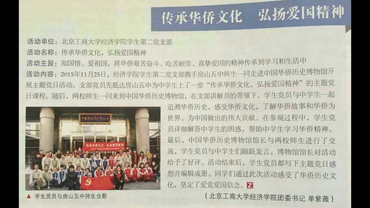 3月,北京市委综合性党员教育刊物《北京支部生活》第三期刊登了以《传承华侨文化弘扬爱国精神——北京工商大学经济学院学生党支部携手房山五中走进中国华侨历史博物馆》为题的主题党日活动。现将全文转载如下: