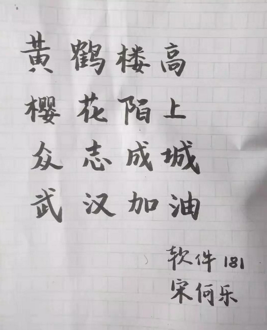 战胜疫情,共克时艰。全体武汉同学们,让我们携手并肩,与全国人民一道,弘扬中国精神,发扬民族文化,凝聚全体力量,汇聚中国之魂,万众一心,众志成城,不畏艰险,不畏顽疾,相信国家,相信政府,共赢防控阻击战,共筑健康中国梦!(电子181 高炜)
