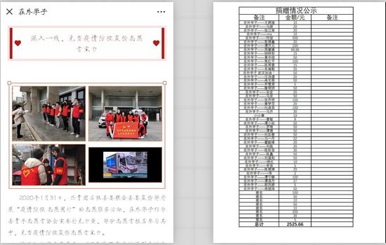 2月7日,所有在外学子收到了来自组委会的一条群消息:“各位在外学子:大家好!截止今天,石柱在外学子志愿服务队发起的抗击疫情捐款倡议共收到53人捐款,总计2525.66元。所收款项我们将全部移交给石柱土家族自治县红十字会,捐款详情也将在官方公众号上进行公示。谢谢大家!”