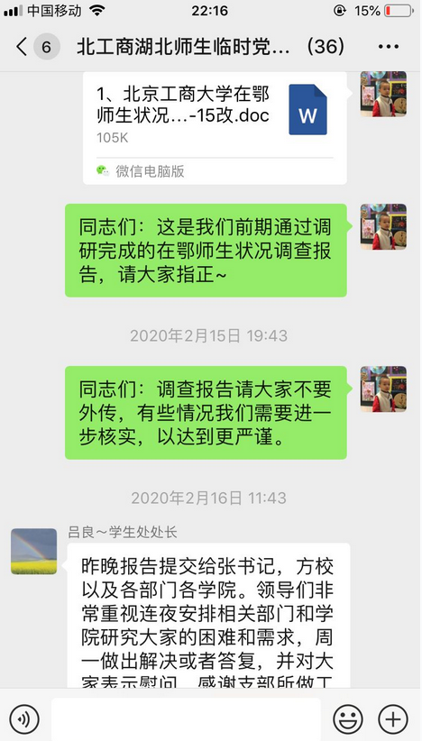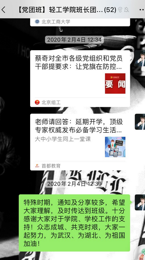艺术与传媒学院辅导员徐亮是湖北人。疫情发生后,徐亮老师没有退缩,而是勇挑重担,经学校党委批准,徐亮老师担任由28名在鄂师生党员组成的湖北师生临时党支部书记。面对这项光荣而艰巨的任务,徐亮老师第一时间动员支部成员,发挥支部战斗堡垒作用,发布在鄂师生倡议书,提醒每日健康通报,征集抗疫文艺作品。同时,徐老师面向在鄂142名师生进行线上问卷调查,梳理在鄂师生现状、困难、建议,整理网课学习情况,及时反馈学校。在徐老师的带动下,党支部的28名党员活跃在北工商在鄂本科生群、研究生群、湖北学生家长群,在各项工作中发挥着重要作用。