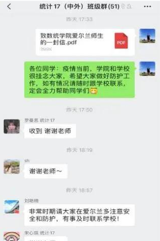 远赴重洋求学的64名学子,虽不在国内,但他们仍旧被数学与统计学院辅导员李鑫挂念。李老师主动通过微信、QQ等方式与他们保持“点对点”联系,及时掌握学生动态,确保信息上报无“死角”。他在海外学子最焦虑的时刻,用一条条疫情的通报、一句句暖心的问候、一串串温暖的字符,疏导着焦虑,安抚着情绪,传递着信心。在了解到学生无法在爱尔兰购买到防护口罩的情况后,李老师多方联系,成功为学生配齐口罩并于近期寄往爱尔兰,用实际行动守护学生的健康与安全。