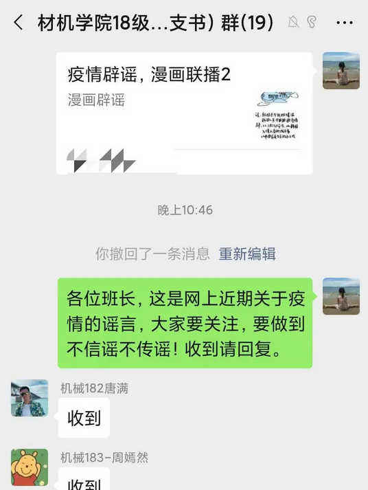 当“抢购双黄连”、“喝酒抗病毒”、“环保酵素抑菌杀毒”等谣言不时出现,材料与机械工程学院辅导员邓浩为避免学生轻信上当,及时查阅资料,收集官方信息,不间断在朋友圈、微信群宣传最新防控知识。同时,邓老师动员团学骨干开展“粉碎抗疫谣言”工作,主动破除网络谣言,引导学生不造谣、不信谣、不传谣,做好一名抗“疫”网络安全知识的宣传员。