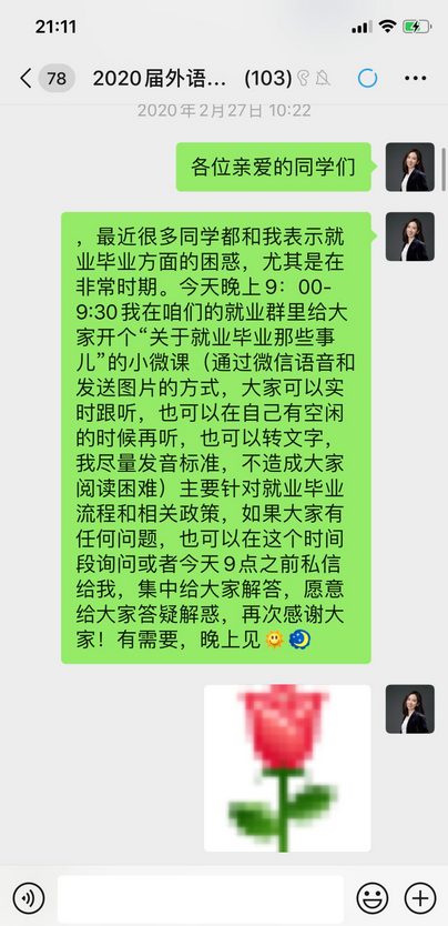 疫情当前,每名大四学生的就业都牵动着外国语学院辅导员张悦的心。她围绕“云就业”开展工作。每天花费大量时间搜集招聘信息,将最优质的岗位招聘发给毕业生,鼓励学生认真准备,以最良好的精神面貌迎接招聘单位。同时,张老师认真开展就业指导,细心解答同学们最关注的考研复试、出国留学、自主创业等问题,为学生一对一办理就业生推荐表、三方协议等就业手续。