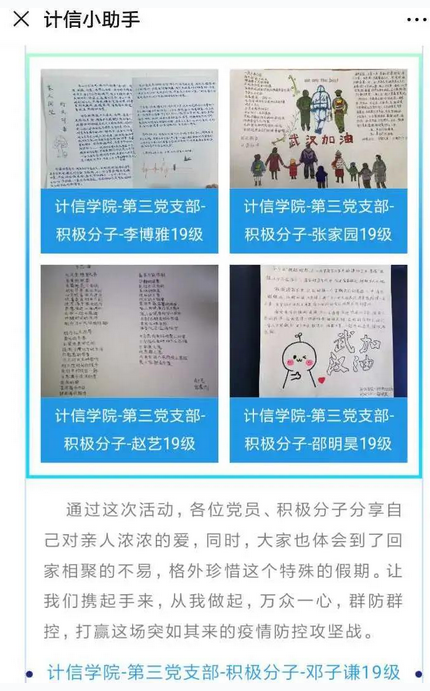 计算机与信息工程学院辅导员李文静充分调动学生党员活力,组织本科生党支部深入学习习近平总书记关于疫情防控工作系列重要讲话和指示精神,组织丰富多彩的党员活动,如“致武汉同学的一封信”、“党员陪你读书”、“身宅心不宅”系列活动等。特别值得一提的是,李老师带领党支部成员以“共抗疫情、爱国力行”为主题,共同回顾2003年抗击非典和本次抗击新冠病毒的感人故事,深入爱国育人价值,引导学生用历史的眼光,理性看待疫情,激发学生的爱国情怀,以及为国家发展贡献力量的动力和决心。