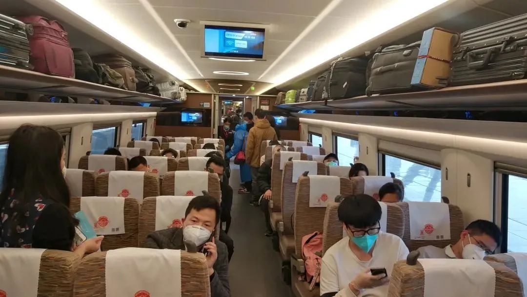 测量体温,出示健康码,核验名单……经过一系列程序后,我们登上了回京的火车。与以往“春运”返程相比,专列乘客以中青年为主,车厢内的人员密度也低了一些,乘务员会分时段给乘客测量体温。本着对自己和国家负责的态度,我一路上没摘过口罩,没有吃饭和喝水。