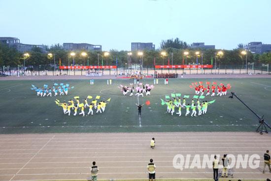 北京工商大学的大学生们在校运会开幕式上跳起竹竿舞