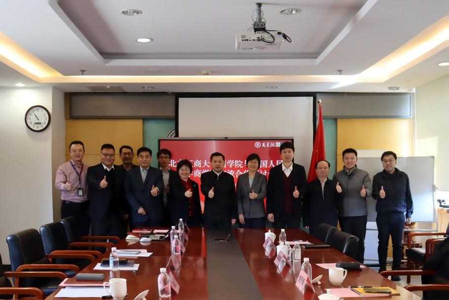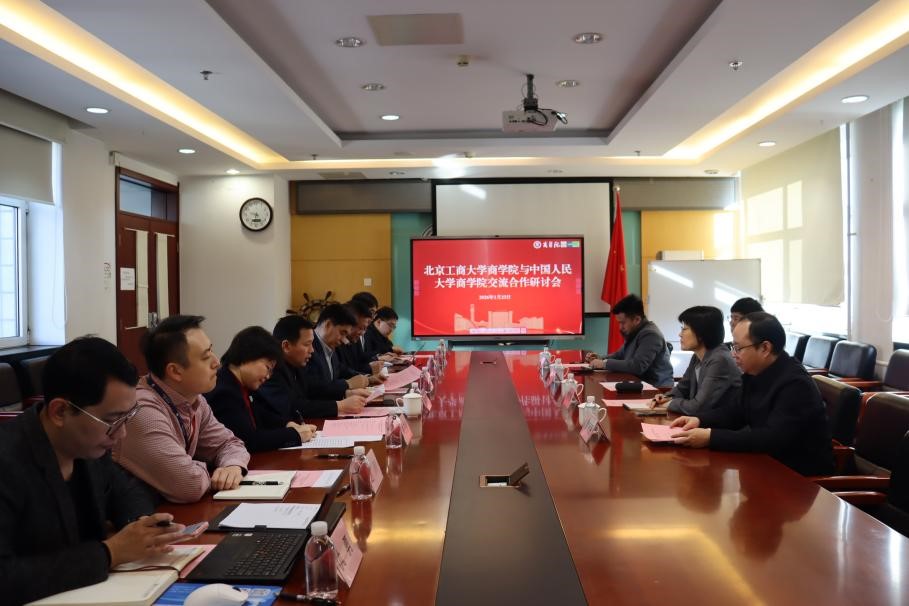 1月23日上午,中国人民大学商学院领导班子到访北京工商大学,与商学院举行交流合作研讨会。北京工商大学党委常委、副校长寇红江,中国人民大学商学院党委书记旋天颖、院长易靖韬、党委副书记廖冠民、办公室主任王蒙,北京工商大学国内交流与合作处处长张晓磊,商学院党委书记樊江涛、院长何玉润及班子成员等出席会议。会议由北京工商大学商学院党委书记樊江涛主持。