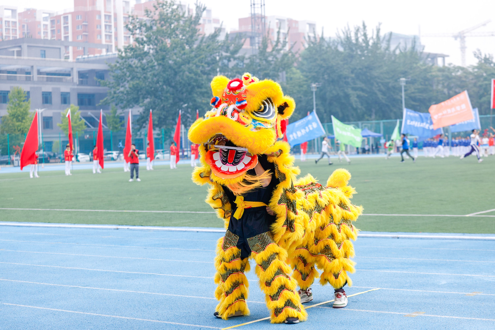恰同学少年,风华正茂。伴着《运动员进行曲》高昂的旋律,运动员代表队昂首挺胸地走进田径场,进行广播体操表演,他们身着院服,口号嘹亮,精神抖擞。挥舞的旗帜、整齐的队形。莘莘学子以蓬勃青春活力。尽显新生们昂扬向上的学子风采。