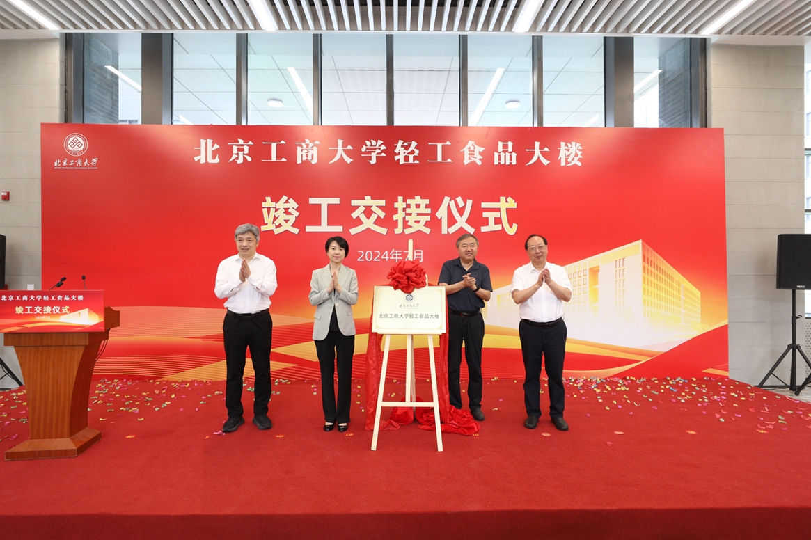 市委教育工委委员、市教委副主任王方,房山区区委常委、副区长靳璐,北京建工集团有限责任公司副总经理陈连义,北京工商大学党委书记黄先开共同为轻工食品大楼揭牌。