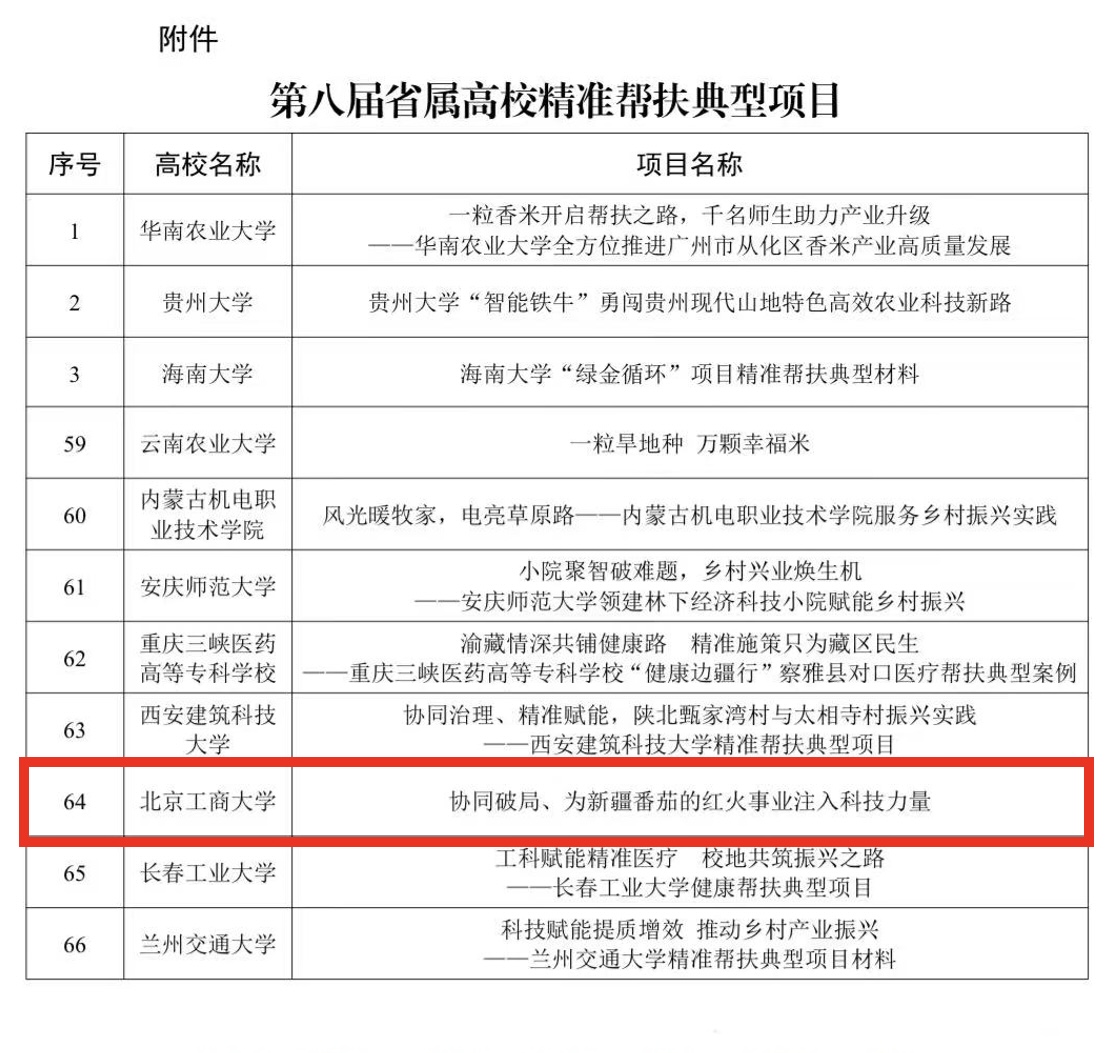 近日,教育部公布第八届省属高校精准帮扶典型项目推选结果。经各省级教育行政部门和承担定点帮扶任务的直属高校投票,本次共推选出66个典型项目。我校申报的《协同破局、为新疆番茄的红火事业注入科技力量》成功入选,这是学校深入贯彻落实乡村振兴战略,发挥学科优势、服务边疆发展的又一重要成果。
