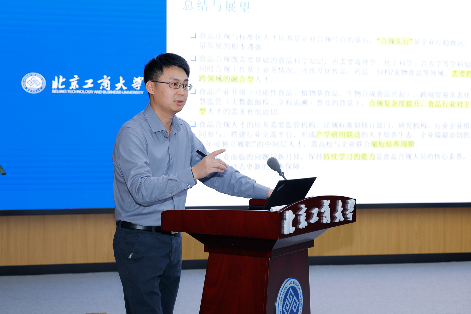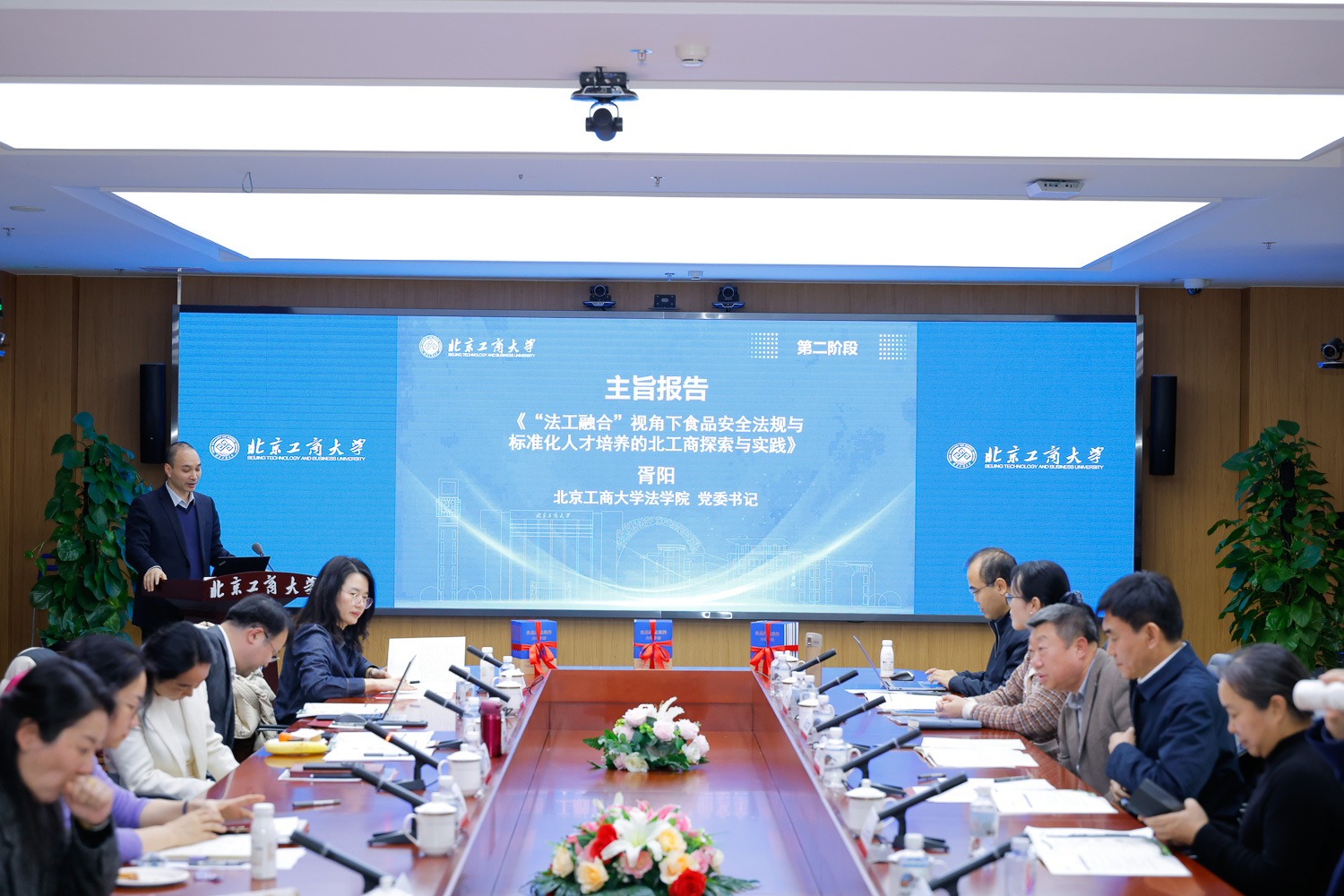 会议主旨报告与专题报告环节由北京工商大学法学院院长陈敦主持。胥阳以“‘法工融合’视角下食品安全法规与标准化人才培养的北工商探索与实践”为题作专题报告。他指出,当前立法、司法、执法领域及企业合规管理、国际规则应对、风险沟通等方面均存在复合型人才稀缺问题。高校作为中坚力量,需发挥连接政府、行业协会、企业的纽带作用,推动多方协同育人。基于此,学校构建“跨学科课程体系+能力培养三阶递进+政行企所四方联动实践”的培养模式,课程体系规划为五大课程群,涵盖食品安全法规核心课程群、企业合规管理课程群、标准化课程群、实践教学模块及交叉融合模块。他提到,法学院将已联合食品与健康学院,依托行业资源开设更科学全面的交叉课程,同时直面生源选拔、师资激励、课程共识构建等挑战,在实践中不断完善,期待汇聚各方智慧共同完善培养体系。
