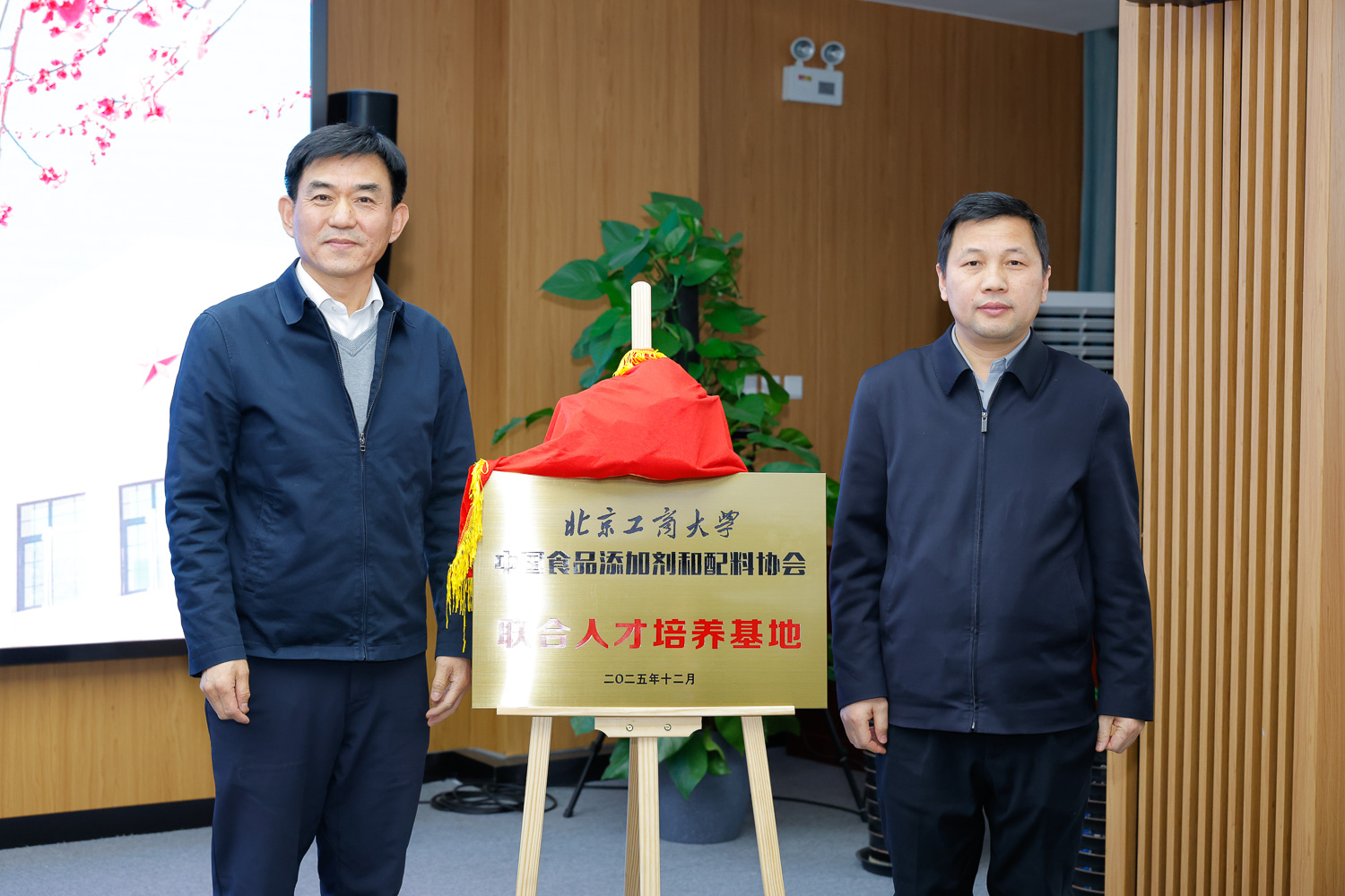 会上,北京工商大学与中国食品添加剂和配料协会正式签署产教融合共同体合作协议,我校党委常委、副校长寇红江与中国食品添加剂和配料协会理事长杜雅正共同为联合人才培养基地揭牌。