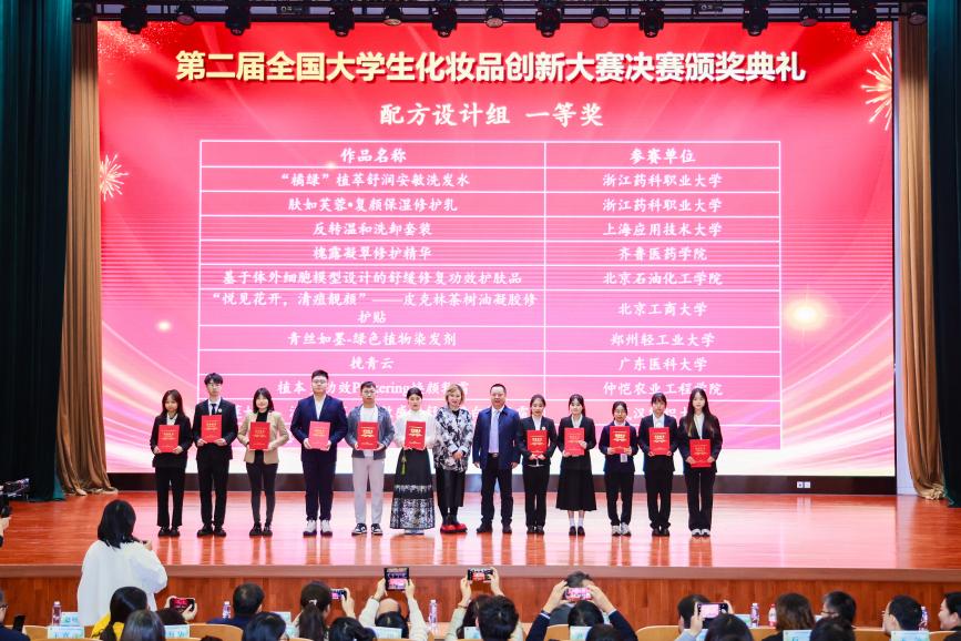 11月2日举办第二届全国大学生化妆品创新大赛决赛颁奖典礼。学校党委常委、副校长郑文红,山东花物堂生物科技有限公司总经理亓丰伟,广州环亚化妆品科技有限公司美肤宝线下营销渠道总经理朱晓宏,知名成分党博主江彪分别致辞。王万绪、董银卯、暨南大学生命科学技术学院院长白卫滨、大赛组委会成员、决赛评审专家以及行业企业领导、专家、高校教师、学生代表均参加大会。颁奖典礼由学校轻工科学与工程学院党委书记姚志良主持。