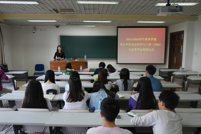 胡燕霞老师宣读了《2015-2016学年秋季学期食品学院食品科学与工程(国际)专业奖学金获奖学生名单》,在祝贺获奖同学的同时,告诫同学们戒骄戒躁、继续努力,在新的学期取得更加优异的成绩。随后,与会的各位领导和老师分别为优秀学生奖学金、专业课优胜奖学金、英语优胜奖学金、学业突出进步奖获奖学生颁奖。