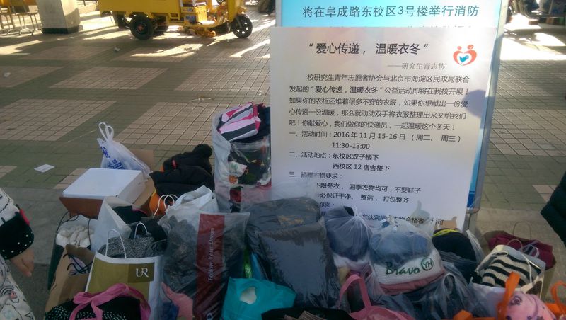 11月15日-16日,我校研究生青年志愿者协会开展了第五届“爱心捐赠,温暖衣冬”闲置衣物捐赠活动,期间吸引捐赠者总计256人,募集衣物320kg。活动由研究生青志协主办,并得到海淀区民政局捐赠中心的支持。