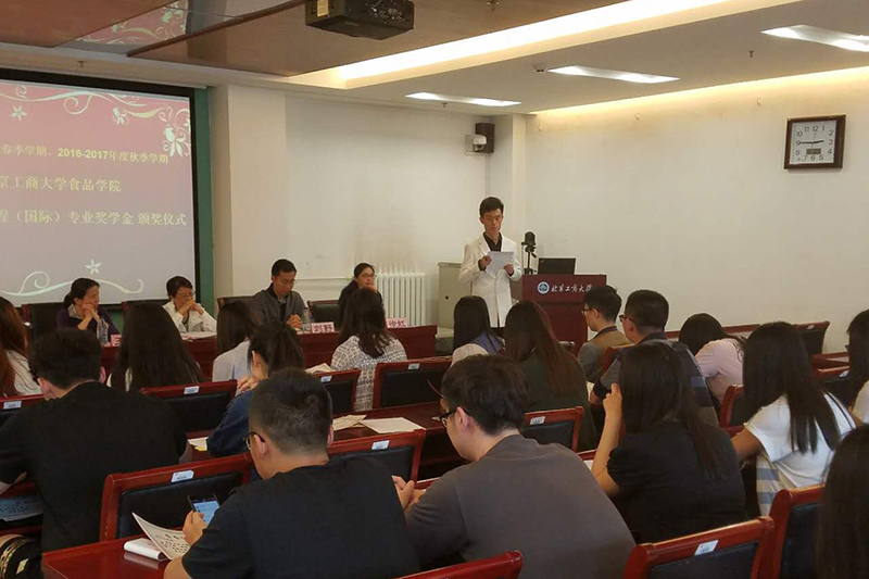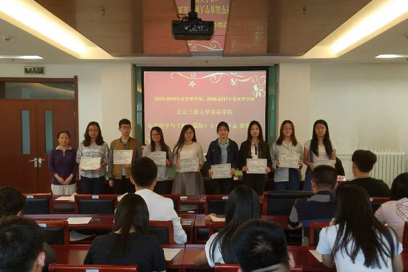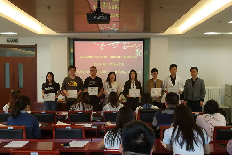 食品学院食品科学与工程系主任王静宣读了《2015-2016年度春季学期、2016-2017年度秋季学期食品学院食品科学与工程(国际)专业奖学金获奖学生名单》。随后,与会各位领导、老师分别为优秀学生奖学金、专业课优胜奖学金、英语优胜奖学金、学业突出进步奖获奖学生颁奖。