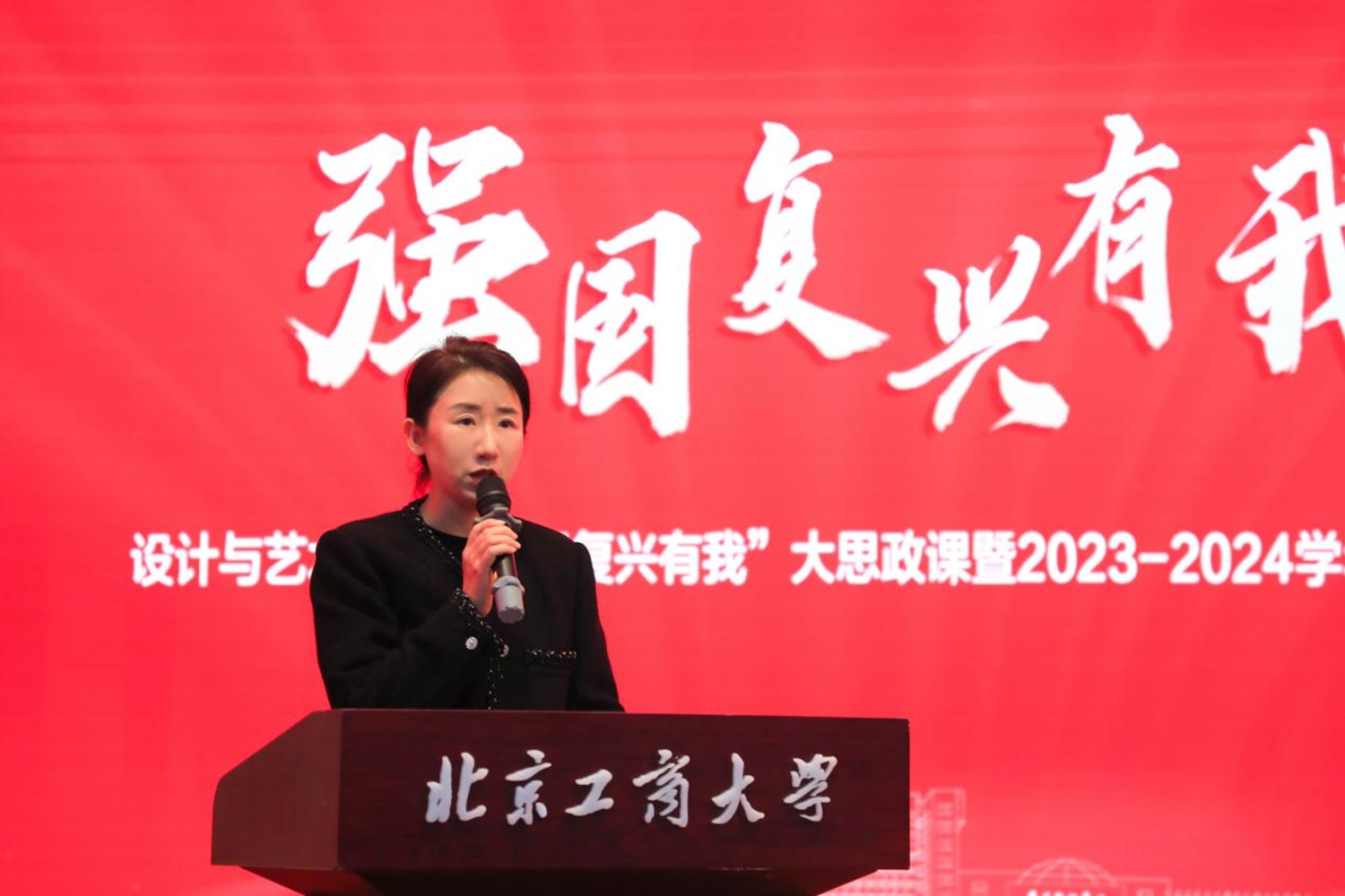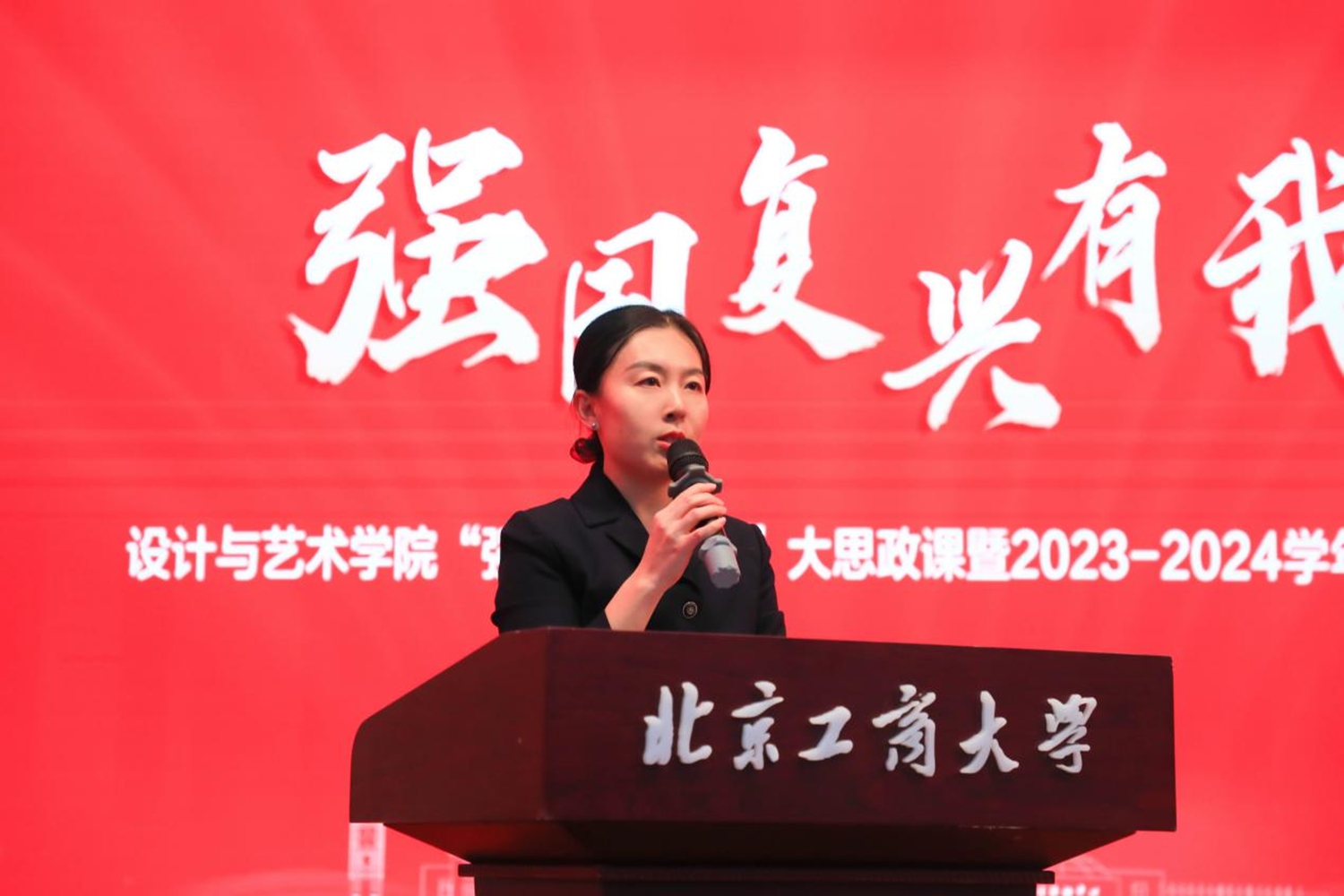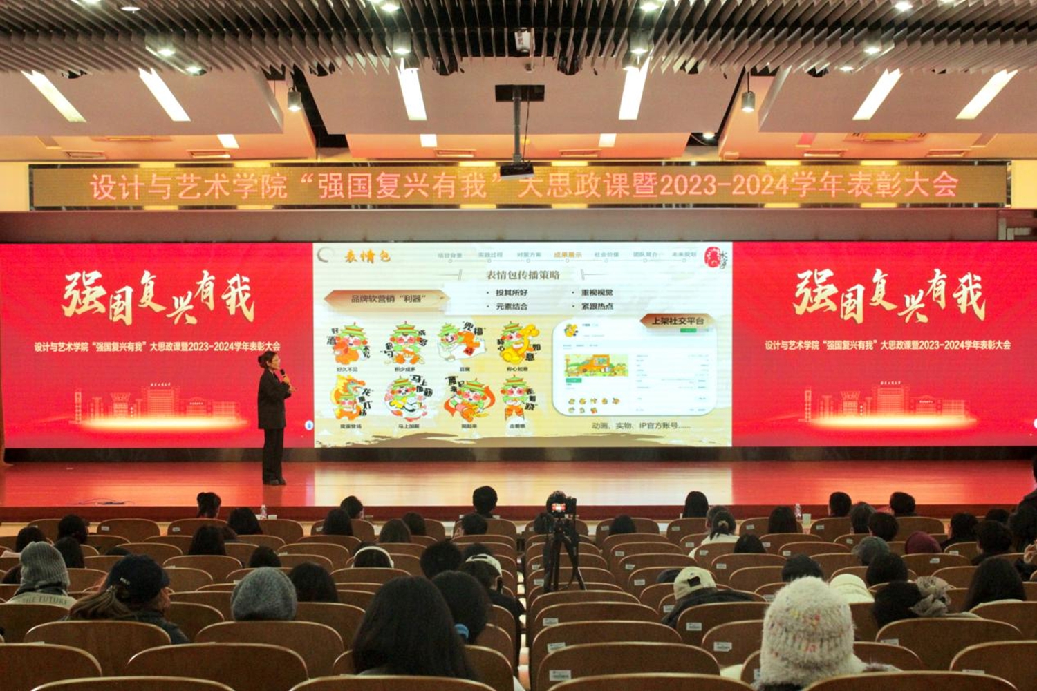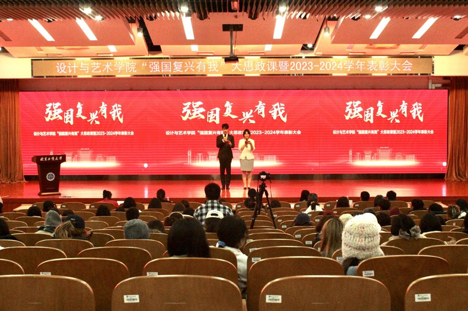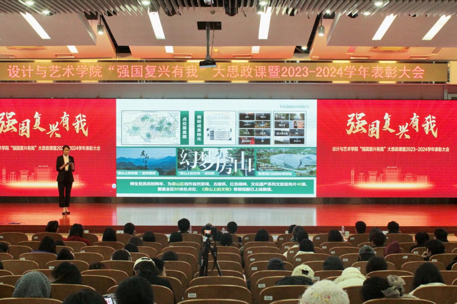 12月19日下午,设计与艺术学院“强国复兴有我”大思政课暨2023—2024学年表彰大会在良乡主校区B报告厅举行。校党委学生工作部、武装部部长郑光、校团委书记单紫薇、学院党委书记王海伟、学院党委副书记尹航、学院院长助理张明出席大会,学院优秀教师代表、学生代表参加大会。