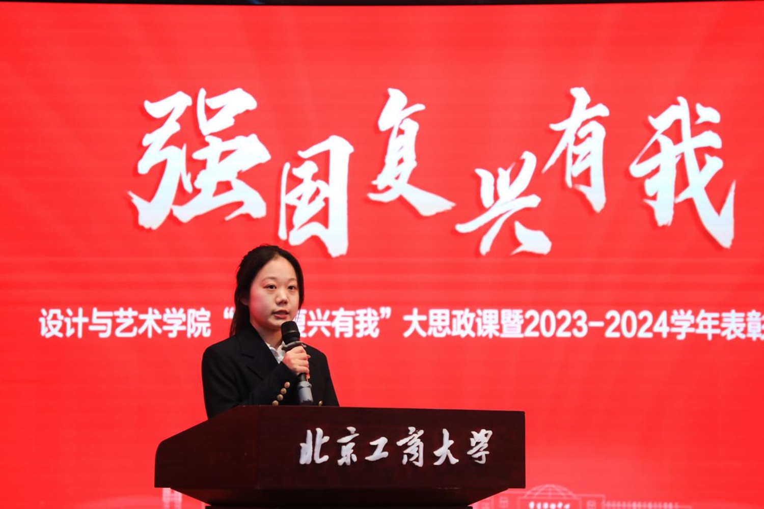 大会在庄严的国歌声中拉开帷幕。王海伟为大会致辞。一年来,学院强化党建引领,聚焦人才培养,全院师生勇毅拼搏、锐意进取,在学业、就业、学科竞赛、服务首都经济社会发展等领域取得了优异的成绩。希望同学们能够以优秀为榜样,在北工商创造属于自己的辉煌,并对同学们提出三点建议:一是以艺树人,青春有所作为。用艺术语言感悟历史精髓,传承红色基因、赓续中华文脉;二是以美培元,追逐青春梦想。感悟时代脉搏,弘扬社会风尚,扎根脚下沃土,以美的方式阐释时代精华;三是以文化人,为青春添彩。保持用艺术创作为社会服务的信心和决心,努力为时代贡献新的价值,勇担时代重担。