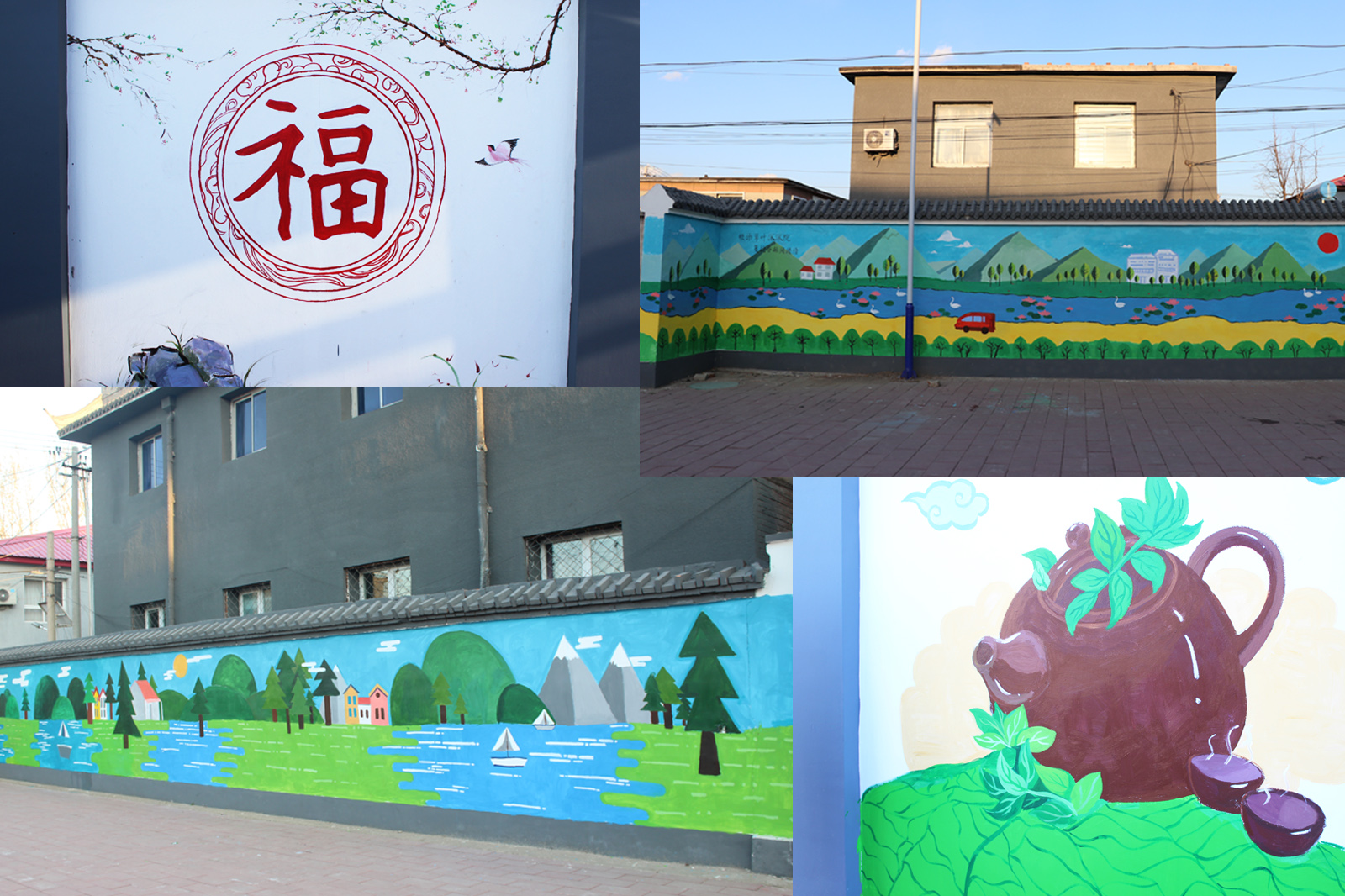 桑叶茶组的同学们在基地认真与村领导商讨设计的墙影壁绘画方案后,有序开展了影壁的绘画工作。经过一天辛苦的绘画,栩栩如生的桑叶茶和茶壶跃然影壁上,代表低收入项目桑叶茶生意兴隆大大的“福”与刚冒尖的桑树嫩叶以及飞鸟融为一体,让项目基地更生动活泼。