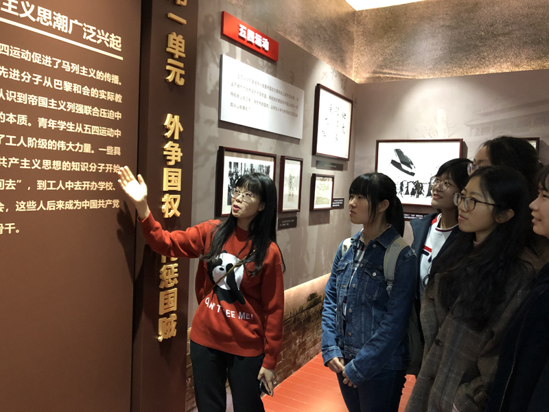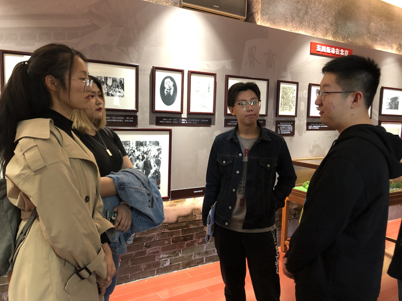 参观过程中,大家自行结成小组进行参观,分享学习感悟。党总支副书记于涛和老师同学们亲切交流参观感受,他谈到,外语青年要时刻铭记自己的社会责任,勇敢地承担起时代赋予我们的使命。同志们认真领悟“五四精神”,回溯追忆当时历史,纷纷表明作为一名学生党员要一如既往继承和发扬革命先辈们艰苦奋斗的精神,勇担使命、砥砺前行。外国语学院本科学生党支部党员原翊翔分享了青年时代的毛主席为民请命,在1919年12月中旬作为湖南公民代表团团长,率团向北京政府请愿的故事,谈到:“天下兴亡,匹夫有责。”作为当代学生党员的我们必须坚定立场,做一些力所能及的事情来爱国。