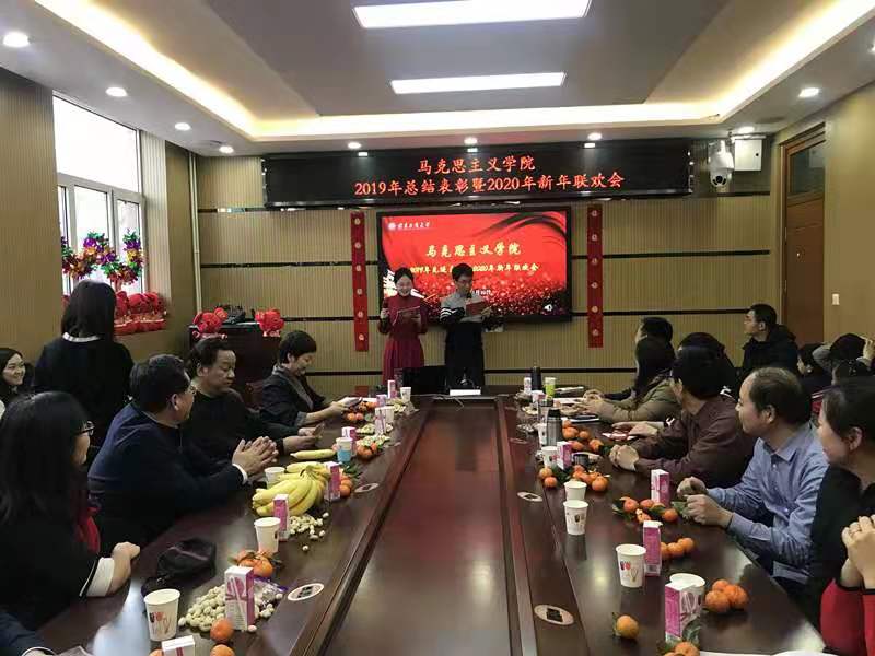 总结会后,联欢会在集体联袂拜年祝福中拉开帷幕,学院领导、院长助理和各教研室主任真诚祝愿大家在新的一年收获满满,梦想成真;现场欢声笑语,洋溢着浓厚的节日气氛。学院教职工演绎了音乐、舞蹈、武术、诗朗诵、情景剧、游戏等形式多样的精彩文艺节目,集中展现了马院人浓厚的家国情怀和深厚的艺术积淀,获得了现场的阵阵掌声和热烈喝彩。歌曲《哲学有点甜》《悦来悦好》《好汉歌》《沿着社会主义大道奔向前》、诗朗诵《七律·到韶山》《七律·到马院》《这一年》、舞蹈《网络热舞串烧》、情景剧《好FUN不怕晚》等节目精彩纷呈,充分展现了马院人的才艺智慧和精神风貌。联欢会在全体大合唱《相亲相爱一家人》的歌声中落下帷幕。