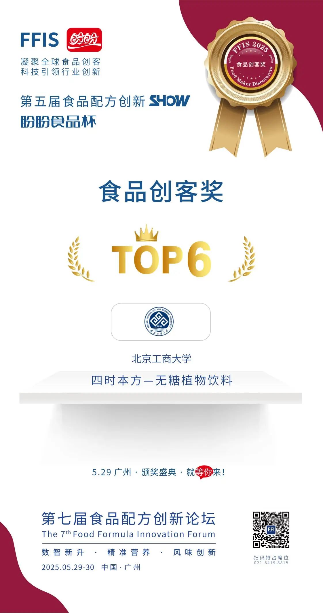 近日,在食品界备受瞩目的第五届食品配方创新SHOW(FFIS)上,北京工商大学食品与健康学院师生团队凭借其匠心独运的创新产品——“四时本方—无糖植物饮料”,从众多参赛作品中脱颖而出,荣获“盼盼食品杯·食品创客奖TOP6”。这一奖项是成品组的最高荣誉,不仅是对我校师生在食品科技创新领域不懈努力的肯定,更是对我校食品学科综合实力和人才培养质量的有力证明。
