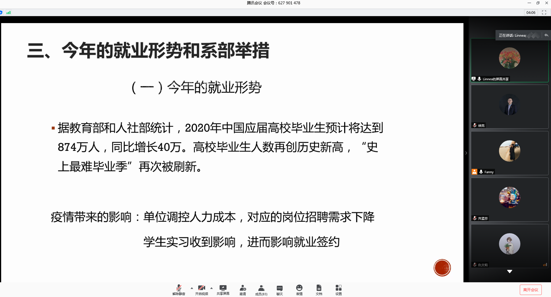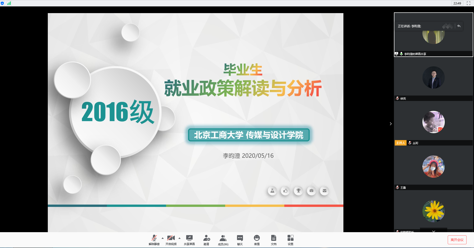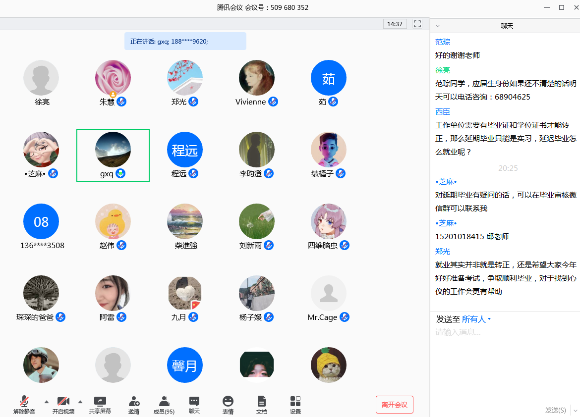 辅导员徐亮、程远、姚悦、李昀澄、邹萍萍分别从就业政策、党团组织关系转出、征兵政策、西部计划、三支一扶、绿色通道、疫情防控等方面提醒毕业生关注关心就业等相关信息,在做好疫情防控的同时,做好思想准备、心理适应和能力储备,坚定信心,积极面对就业。