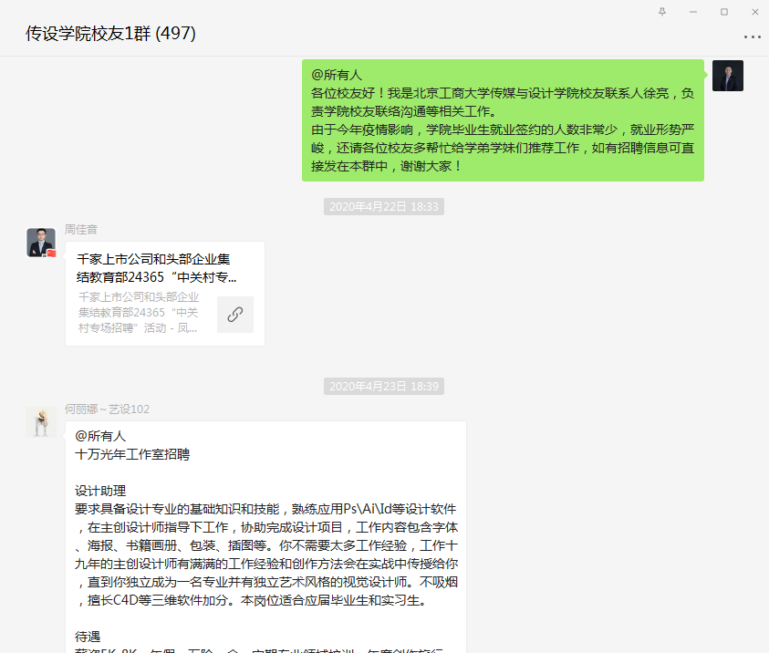 以学校70周年校庆为契机,学院和各专业充分利用校友微信群,发掘校友资源,截至目前,校友们先后向学院提供自己所在单位招聘信息或社会招聘有效信息近百条,就业岗位近200个,部分毕业生通过这些招聘信息,找到了心仪的工作。