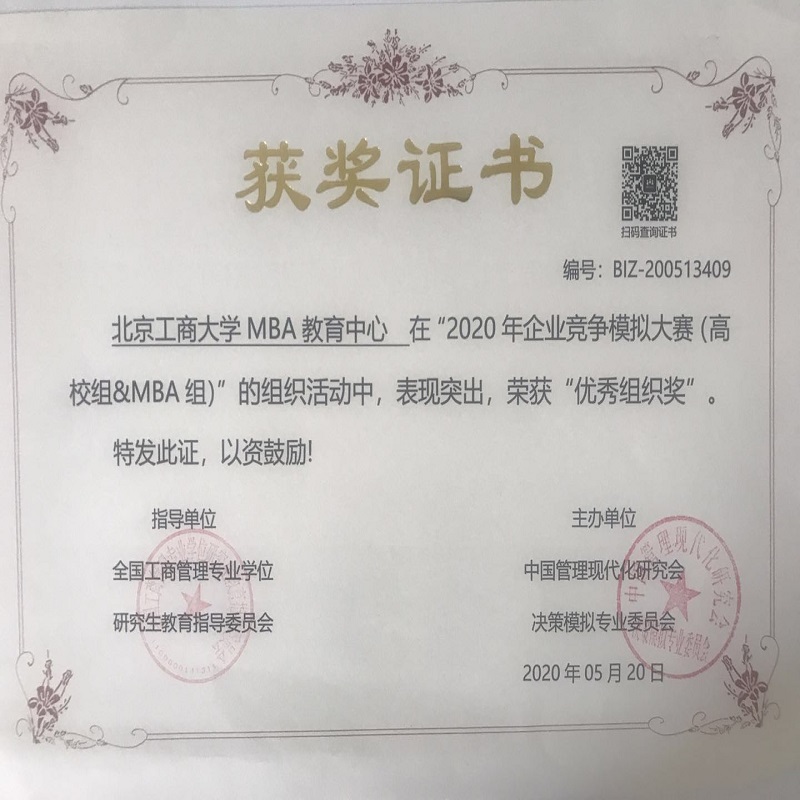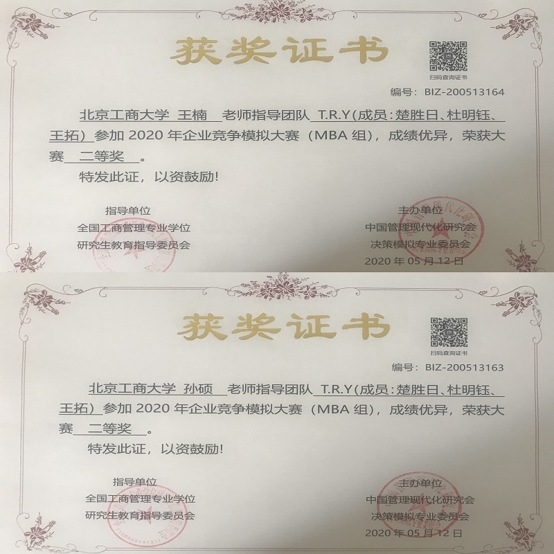 5月10日,2020年企业竞争模拟大赛(高校组&MBA组)落幕,我校MBA教育中心七支MBA队伍参赛,荣获一个二等奖,两个三等奖,指导教师王楠、孙硕荣获优秀指导奖,北京工商大学MBA教育中心荣获优秀组织奖。